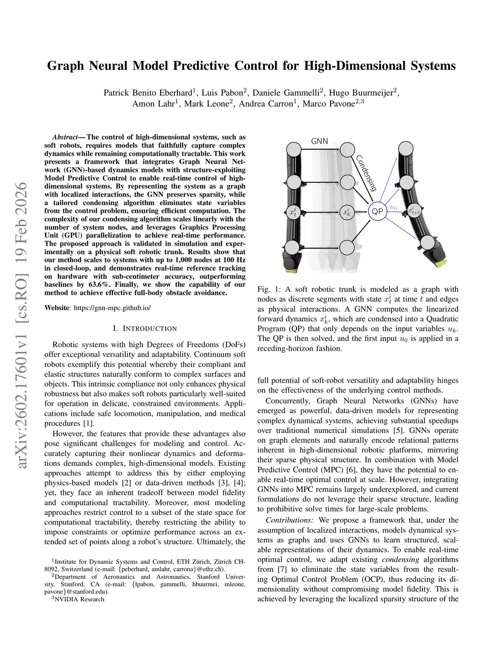 The control of high-dimensional systems, such as soft robots, requires models that faithfully capture complex dynamics while remaining computationally tractable. This work presents a framework that integrates Graph Neural Network (GNN)-based dynamics models with structure-exploiting Model Predictive Control to enable real-time control of high-dimensional systems. By representing the system as a graph with localized interactions, the GNN preserves sparsity, while a tailored condensing algorithm eliminates state variables from the control problem, ensuring efficient computation. The complexity of our condensing algorithm scales linearly with the number of system nodes, and leverages Graphics Processing Unit (GPU) parallelization to achieve real-time performance. The proposed approach is validated in simulation and experimentally on a physical soft robotic trunk. Results show that our method scales to systems with up to 1,000 nodes at 100 Hz in closed-loop, and demonstrates real-time reference tracking on hardware with sub-centimeter accuracy, outperforming baselines by 63.6%. Finally, we show the capability of our method to achieve effective full-body obstacle avoidance.