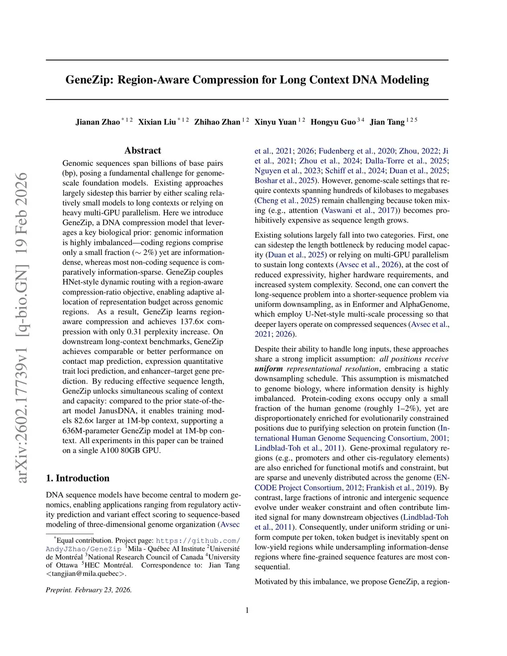 Genomic sequences span billions of base pairs (bp), posing a fundamental challenge for genome-scale foundation models. Existing approaches largely sidestep this barrier by either scaling relatively small models to long contexts or relying on heavy multi-GPU parallelism. Here we introduce GeneZip, a DNA compression model that leverages a key biological prior: genomic information is highly imbalanced. Coding regions comprise only a small fraction (about 2 percent) yet are information-dense, whereas most non-coding sequence is comparatively information-sparse. GeneZip couples HNet-style dynamic routing with a region-aware compression-ratio objective, enabling adaptive allocation of representation budget across genomic regions. As a result, GeneZip learns region-aware compression and achieves 137.6x compression with only 0.31 perplexity increase. On downstream long-context benchmarks, GeneZip achieves comparable or better performance on contact map prediction, expression quantitative trait loci prediction, and enhancer-target gene prediction. By reducing effective sequence length, GeneZip unlocks simultaneous scaling of context and capacity: compared to the prior state-of-the-art model JanusDNA, it enables training models 82.6x larger at 1M-bp context, supporting a 636M-parameter GeneZip model at 1M-bp context. All experiments in this paper can be trained on a single A100 80GB GPU.