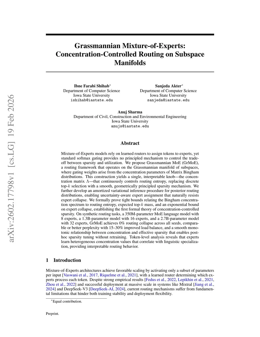 Mixture-of-Experts models rely on learned routers to assign tokens to experts, yet standard softmax gating provides no principled mechanism to control the tradeoff between sparsity and utilization. We propose Grassmannian MoE (GrMoE), a routing framework that operates on the Grassmannian manifold of subspaces, where gating weights arise from the concentration parameters of Matrix Bingham distributions. This construction yields a single, interpretable knob -- the concentration matrix -- that continuously controls routing entropy, replacing discrete top- selection with a smooth, geometrically principled sparsity mechanism. We further develop an amortized variational inference procedure for posterior routing distributions, enabling uncertainty-aware expert assignment that naturally resists expert collapse. We formally prove tight bounds relating the Bingham concentration spectrum to routing entropy, expected top- mass, and an exponential bound on expert collapse, establishing the first formal theory of concentration-controlled sparsity. On synthetic routing tasks, a 350M-parameter MoE language model with 8 experts, a 1.3B-parameter model with 16 experts, and a 2.7B-parameter model with 32 experts, GrMoE achieves 0\% routing collapse across all seeds, comparable or better perplexity with 15--30\% improved load balance, and a smooth monotonic relationship between concentration and effective sparsity that enables post-hoc sparsity tuning without retraining. Token-level analysis reveals that experts learn heterogeneous concentration values that correlate with linguistic specialization, providing interpretable routing behavior.