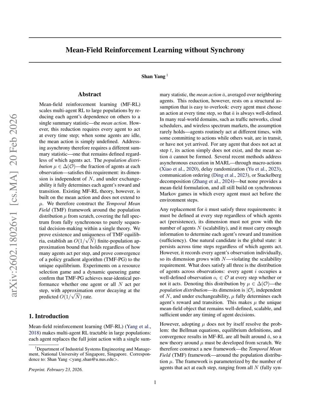 Mean-field reinforcement learning (MF-RL) scales multi-agent RL to large populations by reducing each agent's dependence on others to a single summary statistic -- the mean action. However, this reduction requires every agent to act at every time step; when some agents are idle, the mean action is simply undefined. Addressing asynchrony therefore requires a different summary statistic -- one that remains defined regardless of which agents act. The population distribution -- the fraction of agents at each observation -- satisfies this requirement: its dimension is independent of , and under exchangeability it fully determines each agent's reward and transition. Existing MF-RL theory, however, is built on the mean action and does not extend to . We therefore construct the Temporal Mean Field (TMF) framework around the population distribution from scratch, covering the full spectrum from fully synchronous to purely sequential decision-making within a single theory. We prove existence and uniqueness of TMF equilibria, establish an finite-population approximation bound that holds regardless of how many agents act per step, and prove convergence of a policy gradient algorithm (TMF-PG) to the unique equilibrium. Experiments on a resource selection game and a dynamic queueing game confirm that TMF-PG achieves near-identical performance whether one agent or all act per step, with approximation error decaying at the predicted rate.