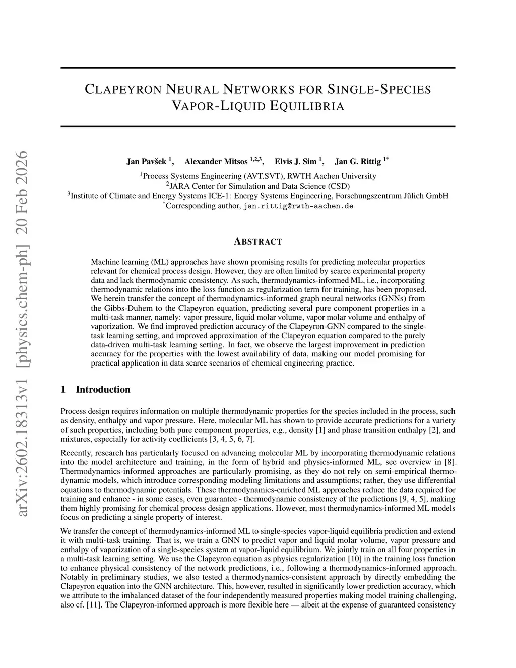 Machine learning (ML) approaches have shown promising results for predicting molecular properties relevant for chemical process design. However, they are often limited by scarce experimental property data and lack thermodynamic consistency. As such, thermodynamics-informed ML, i.e., incorporating thermodynamic relations into the loss function as regularization term for training, has been proposed. We herein transfer the concept of thermodynamics-informed graph neural networks (GNNs) from the Gibbs-Duhem to the Clapeyron equation, predicting several pure component properties in a multi-task manner, namely: vapor pressure, liquid molar volume, vapor molar volume and enthalpy of vaporization. We find improved prediction accuracy of the Clapeyron-GNN compared to the single-task learning setting, and improved approximation of the Clapeyron equation compared to the purely data-driven multi-task learning setting. In fact, we observe the largest improvement in prediction accuracy for the properties with the lowest availability of data, making our model promising for practical application in data scarce scenarios of chemical engineering practice.