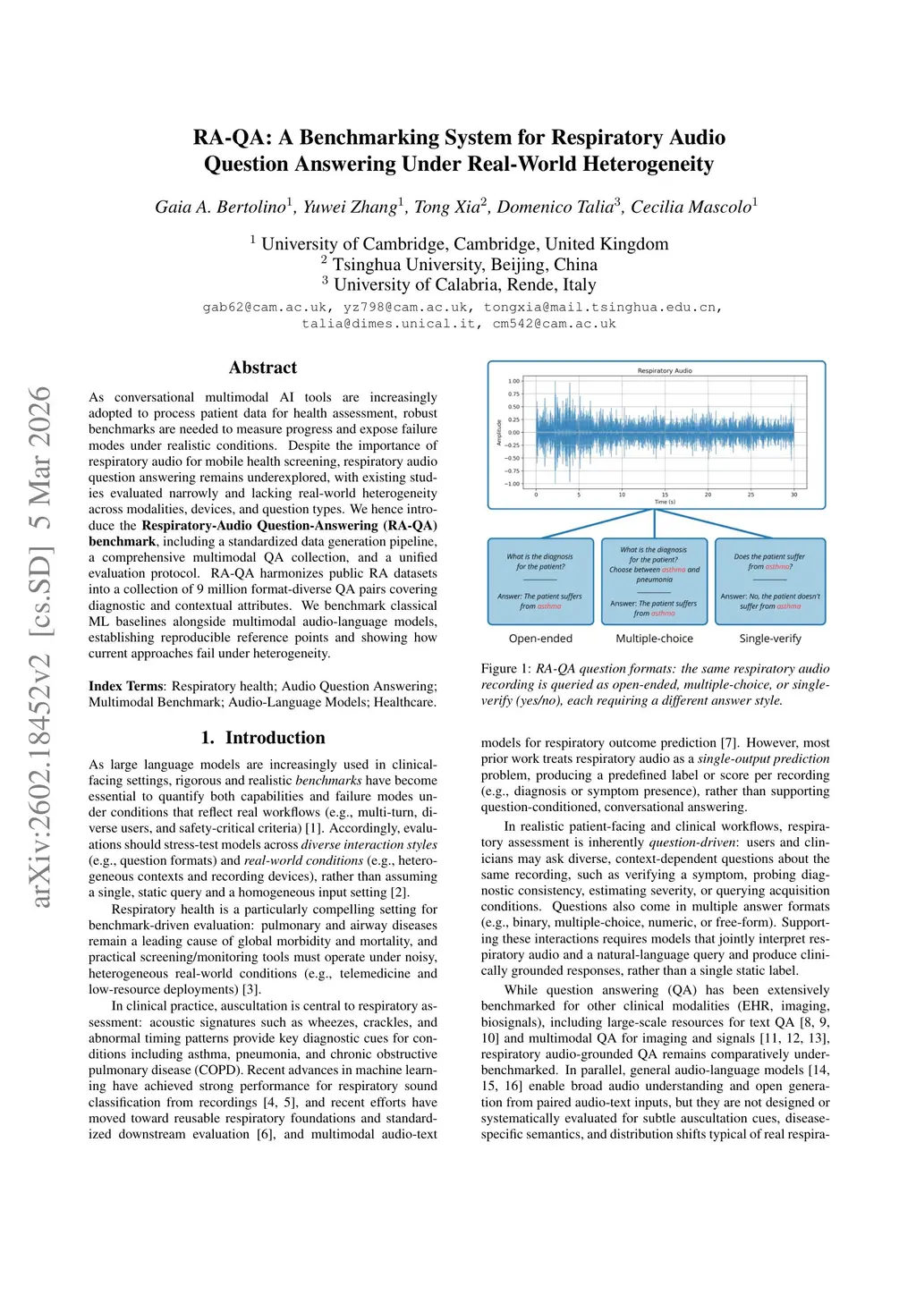 As conversational multimodal AI tools are increasingly adopted to process patient data for health assessment, robust benchmarks are needed to measure progress and expose failure modes under realistic conditions. Despite the importance of respiratory audio for mobile health screening, respiratory audio question answering remains underexplored, with existing studies evaluated narrowly and lacking real-world heterogeneity across modalities, devices, and question types. We hence introduce the Respiratory-Audio Question-Answering (RA-QA) benchmark, including a standardized data generation pipeline, a comprehensive multimodal QA collection, and a unified evaluation protocol. RA-QA harmonizes public RA datasets into a collection of 9 million format-diverse QA pairs covering diagnostic and contextual attributes. We benchmark classical ML baselines alongside multimodal audio-language models, establishing reproducible reference points and showing how current approaches fail under heterogeneity.