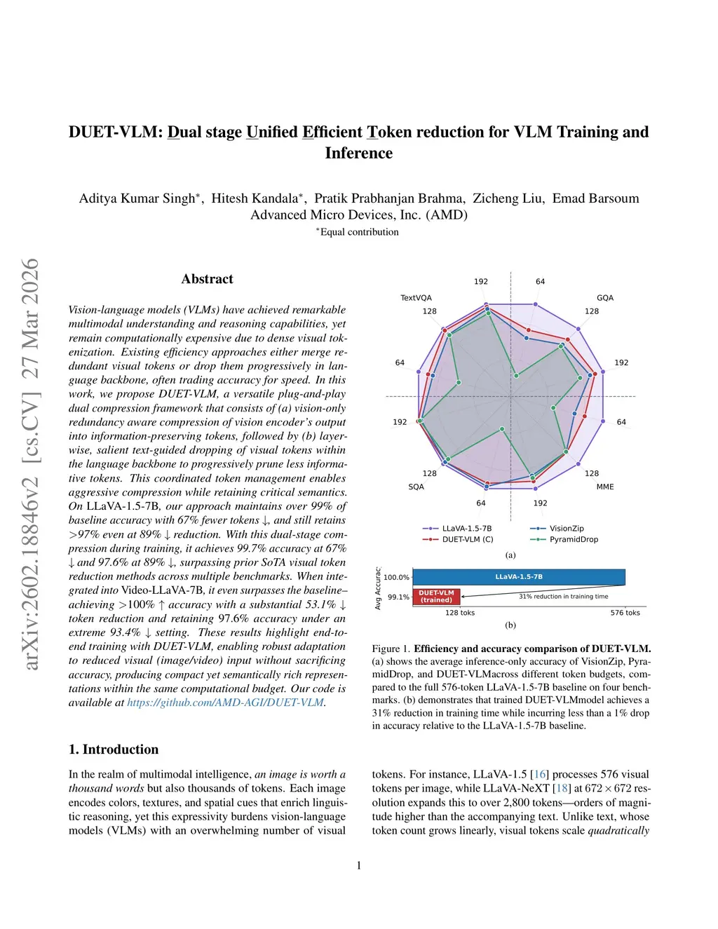 DUET-VLM: Dual stage Unified Efficient Token reduction for VLM Training and Inference