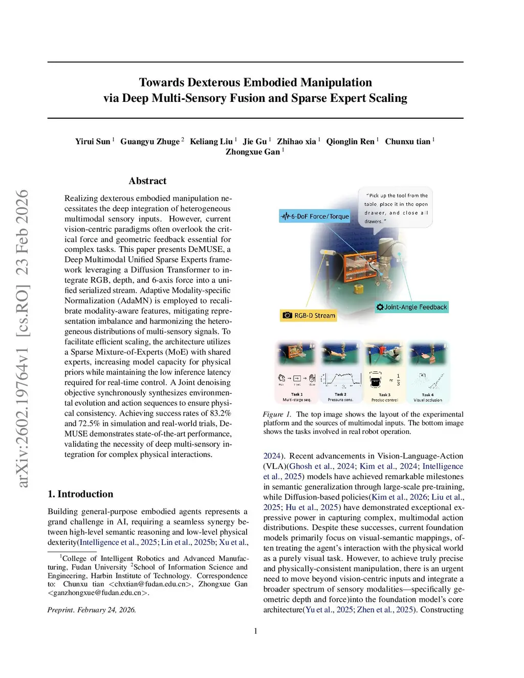 Realizing dexterous embodied manipulation necessitates the deep integration of heterogeneous multimodal sensory inputs. However, current vision-centric paradigms often overlook the critical force and geometric feedback essential for complex tasks. This paper presents DeMUSE, a Deep Multimodal Unified Sparse Experts framework leveraging a Diffusion Transformer to integrate RGB, depth, and 6-axis force into a unified serialized stream. Adaptive Modality-specific Normalization (AdaMN) is employed to recalibrate modality-aware features, mitigating representation imbalance and harmonizing the heterogeneous distributions of multi-sensory signals. To facilitate efficient scaling, the architecture utilizes a Sparse Mixture-of-Experts (MoE) with shared experts, increasing model capacity for physical priors while maintaining the low inference latency required for real-time control. A Joint denoising objective synchronously synthesizes environmental evolution and action sequences to ensure physical consistency. Achieving success rates of 83.2% and 72.5% in simulation and real-world trials, DeMUSE demonstrates state-of-the-art performance, validating the necessity of deep multi-sensory integration for complex physical interactions.