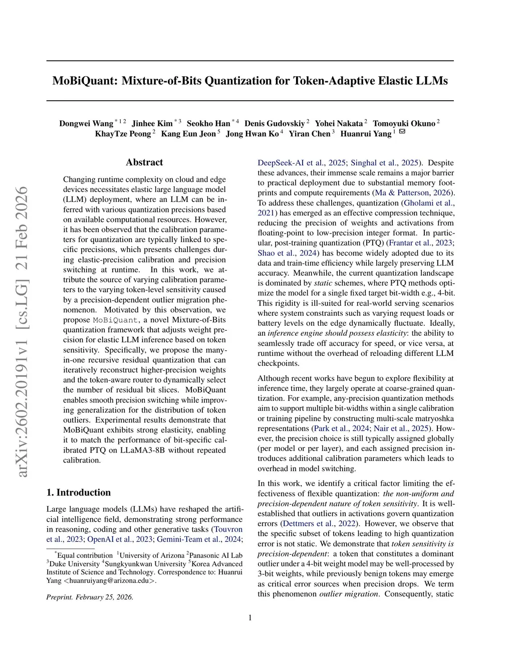 Changing runtime complexity on cloud and edge devices necessitates elastic large language model (LLM) deployment, where an LLM can be inferred with various quantization precisions based on available computational resources. However, it has been observed that the calibration parameters for quantization are typically linked to specific precisions, which presents challenges during elastic-precision calibration and precision switching at runtime. In this work, we attribute the source of varying calibration parameters to the varying token-level sensitivity caused by a precision-dependent outlier migrationthis http URLby this observation, we propose \texttt{MoBiQuant}, a novel Mixture-of-Bits quantization framework that adjusts weight precision for elastic LLM inference based on token sensitivity. Specifically, we propose the many-in-one recursive residual quantization that can iteratively reconstruct higher-precision weights and the token-aware router to dynamically select the number of residual bit slices. MoBiQuant enables smooth precision switching while improving generalization for the distribution of token outliers. Experimental results demonstrate that MoBiQuant exhibits strong elasticity, enabling it to match the performance of bit-specific calibrated PTQ on LLaMA3-8B without repeated calibration.