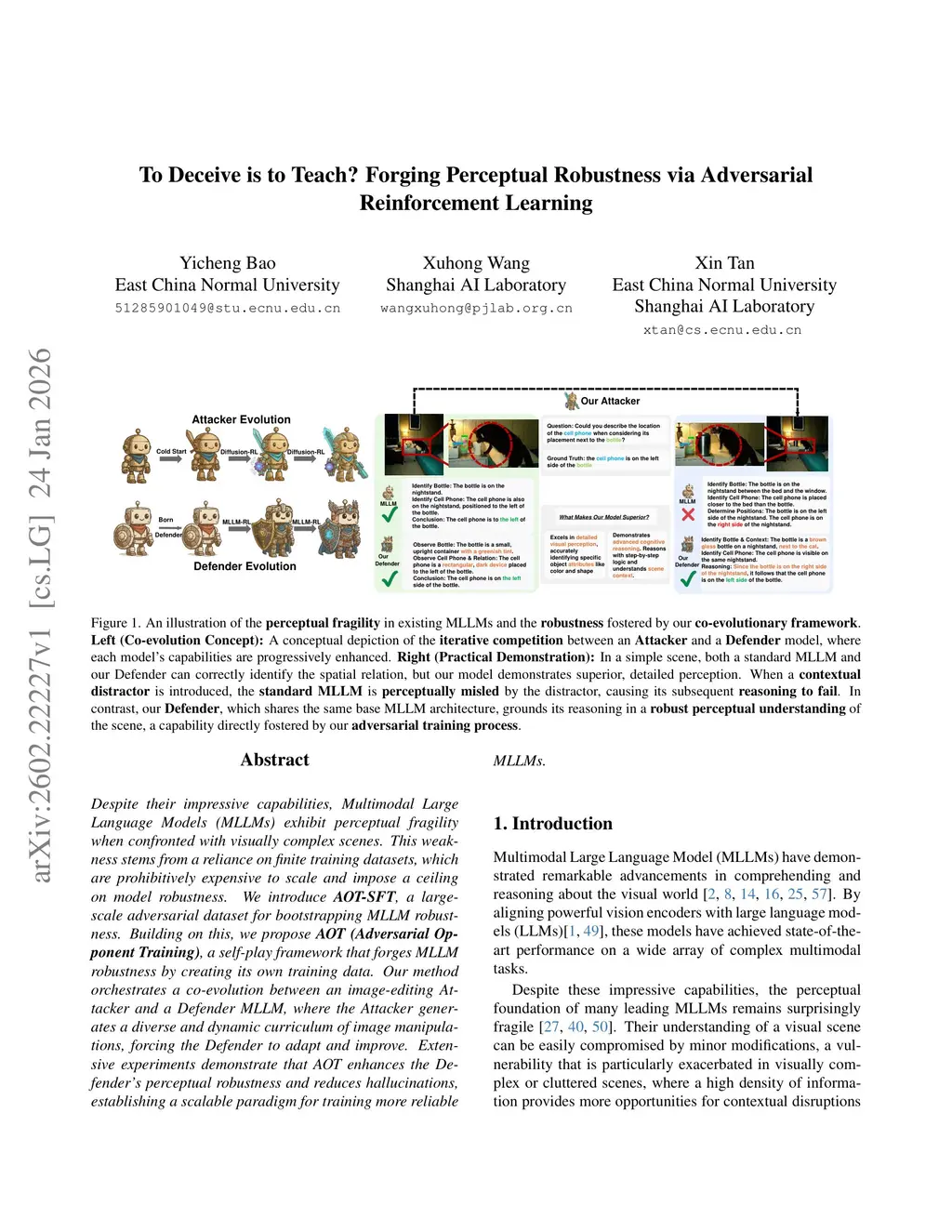 Despite their impressive capabilities, Multimodal Large Language Models (MLLMs) exhibit perceptual fragility when confronted with visually complex scenes. This weakness stems from a reliance on finite training datasets, which are prohibitively expensive to scale and impose a ceiling on model robustness. We introduce \textbf{AOT-SFT}, a large-scale adversarial dataset for bootstrapping MLLM robustness. Building on this, we propose \textbf{AOT (Adversarial Opponent Training)}, a self-play framework that forges MLLM robustness by creating its own training data. Our method orchestrates a co-evolution between an image-editing Attacker and a Defender MLLM, where the Attacker generates a diverse and dynamic curriculum of image manipulations, forcing the Defender to adapt and improve. Extensive experiments demonstrate that AOT enhances the Defender's perceptual robustness and reduces hallucinations, establishing a scalable paradigm for training more reliable MLLMs.