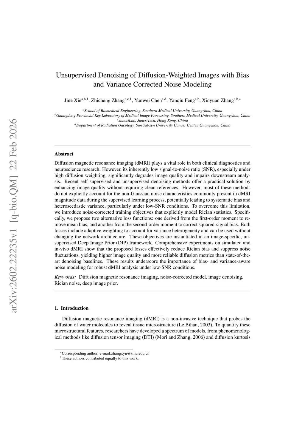 Diffusion magnetic resonance imaging (dMRI) plays a vital role in both clinical diagnostics and neuroscience research. However, its inherently low signal-to-noise ratio (SNR), especially under high diffusion weighting, significantly degrades image quality and impairs downstream analysis. Recent self-supervised and unsupervised denoising methods offer a practical solution by enhancing image quality without requiring clean references. However, most of these methods do not explicitly account for the non-Gaussian noise characteristics commonly present in dMRI magnitude data during the supervised learning process, potentially leading to systematic bias and heteroscedastic variance, particularly under low-SNR conditions. To overcome this limitation, we introduce noise-corrected training objectives that explicitly model Rician statistics. Specifically, we propose two alternative loss functions: one derived from the first-order moment to remove mean bias, and another from the second-order moment to correct squared-signal bias. Both losses include adaptive weighting to account for variance heterogeneity and can be used without changing the network architecture. These objectives are instantiated in an image-specific, unsupervised Deep Image Prior (DIP) framework. Comprehensive experiments on simulated and in-vivo dMRI show that the proposed losses effectively reduce Rician bias and suppress noise fluctuations, yielding higher image quality and more reliable diffusion metrics than state-of-the-art denoising baselines. These results underscore the importance of bias- and variance-aware noise modeling for robust dMRI analysis under low-SNR conditions.