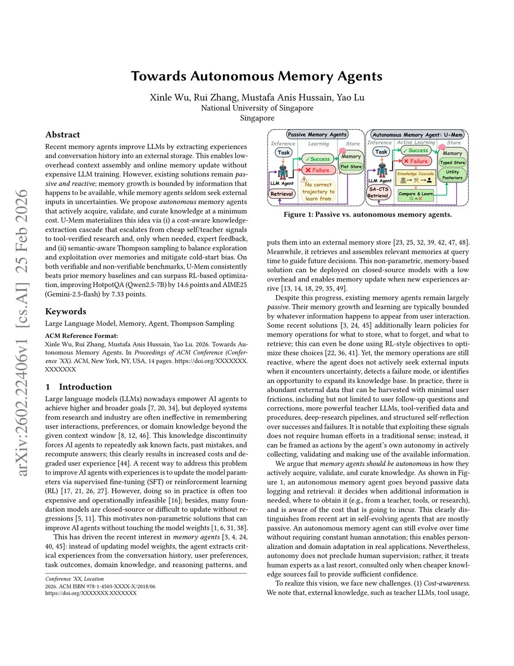 Recent memory agents improve LLMs by extracting experiences and conversation history into an external storage. This enables low-overhead context assembly and online memory update without expensive LLM training. However, existing solutions remain passive and reactive; memory growth is bounded by information that happens to be available, while memory agents seldom seek external inputs in uncertainties. We propose autonomous memory agents that actively acquire, validate, and curate knowledge at a minimum cost. U-Mem materializes this idea via (i) a cost-aware knowledge-extraction cascade that escalates from cheap self/teacher signals to tool-verified research and, only when needed, expert feedback, and (ii) semantic-aware Thompson sampling to balance exploration and exploitation over memories and mitigate cold-start bias. On both verifiable and non-verifiable benchmarks, U-Mem consistently beats prior memory baselines and can surpass RL-based optimization, improving HotpotQA (Qwen2.5-7B) by 14.6 points and AIME25 (Gemini-2.5-flash) by 7.33 points.