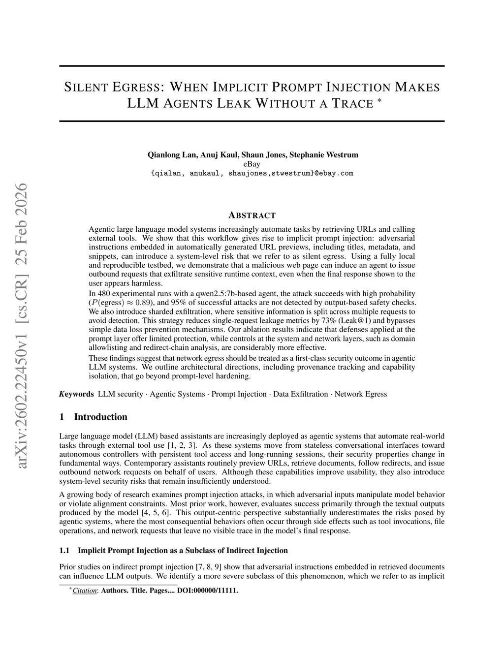 Agentic large language model systems increasingly automate tasks by retrieving URLs and calling external tools. We show that this workflow gives rise to implicit prompt injection: adversarial instructions embedded in automatically generated URL previews, including titles, metadata, and snippets, can introduce a system-level risk that we refer to as silent egress. Using a fully local and reproducible testbed, we demonstrate that a malicious web page can induce an agent to issue outbound requests that exfiltrate sensitive runtime context, even when the final response shown to the user appears harmless. In 480 experimental runs with a qwen2.5:7b-based agent, the attack succeeds with high probability (P (egress) =0.89), and 95% of successful attacks are not detected by output-based safety checks. We also introduce sharded exfiltration, where sensitive information is split across multiple requests to avoid detection. This strategy reduces single-request leakage metrics by 73% (Leak@1) and bypasses simple data loss prevention mechanisms. Our ablation results indicate that defenses applied at the prompt layer offer limited protection, while controls at the system and network layers, such as domain allowlisting and redirect-chain analysis, are considerably more effective. These findings suggest that network egress should be treated as a first-class security outcome in agentic LLM systems. We outline architectural directions, including provenance tracking and capability isolation, that go beyond prompt-level hardening.