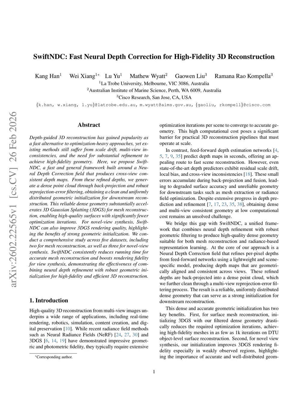 Depth-guided 3D reconstruction has gained popularity as a fast alternative to optimization-heavy approaches, yet existing methods still suffer from scale drift, multi-view inconsistencies, and the need for substantial refinement to achieve high-fidelity geometry. Here, we propose SwiftNDC, a fast and general framework built around a Neural Depth Correction field that produces cross-view consistent depth maps. From these refined depths, we generate a dense point cloud through back-projection and robust reprojection-error filtering, obtaining a clean and uniformly distributed geometric initialization for downstream reconstruction. This reliable dense geometry substantially accelerates 3D Gaussian Splatting (3DGS) for mesh reconstruction, enabling high-quality surfaces with significantly fewer optimization iterations. For novel-view synthesis, SwiftNDC can also improve 3DGS rendering quality, highlighting the benefits of strong geometric initialization. We conduct a comprehensive study across five datasets, including two for mesh reconstruction, as well as three for novel-view synthesis. SwiftNDC consistently reduces running time for accurate mesh reconstruction and boosts rendering fidelity for view synthesis, demonstrating the effectiveness of combining neural depth refinement with robust geometric initialization for high-fidelity and efficient 3D reconstruction.