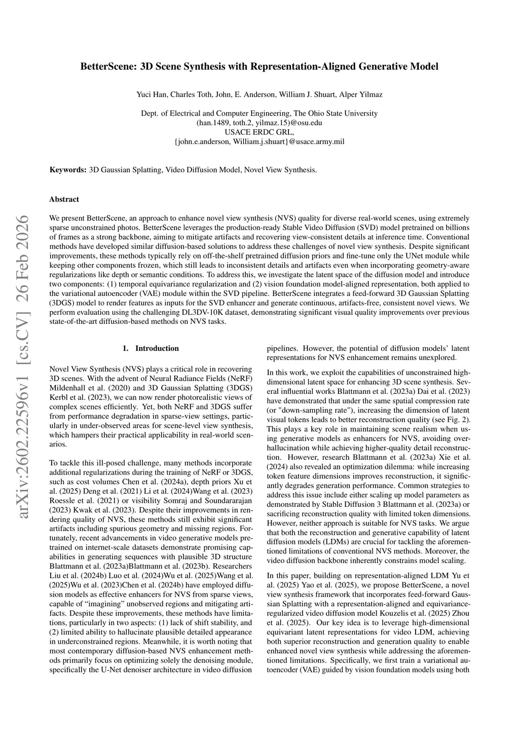 We present BetterScene, an approach to enhance novel view synthesis (NVS) quality for diverse real-world scenes using extremely sparse, unconstrained photos. BetterScene leverages the production-ready Stable Video Diffusion (SVD) model pretrained on billions of frames as a strong backbone, aiming to mitigate artifacts and recover view-consistent details at inference time. Conventional methods have developed similar diffusion-based solutions to address these challenges of novel view synthesis. Despite significant improvements, these methods typically rely on off-the-shelf pretrained diffusion priors and fine-tune only the UNet module while keeping other components frozen, which still leads to inconsistent details and artifacts even when incorporating geometry-aware regularizations like depth or semantic conditions. To address this, we investigate the latent space of the diffusion model and introduce two components: (1) temporal equivariance regularization and (2) vision foundation model-aligned representation, both applied to the variational autoencoder (VAE) module within the SVD pipeline. BetterScene integrates a feed-forward 3D Gaussian Splatting (3DGS) model to render features as inputs for the SVD enhancer and generate continuous, artifact-free, consistent novel views. We evaluate on the challenging DL3DV-10K dataset and demonstrate superior performance compared to state-of-the-art methods.