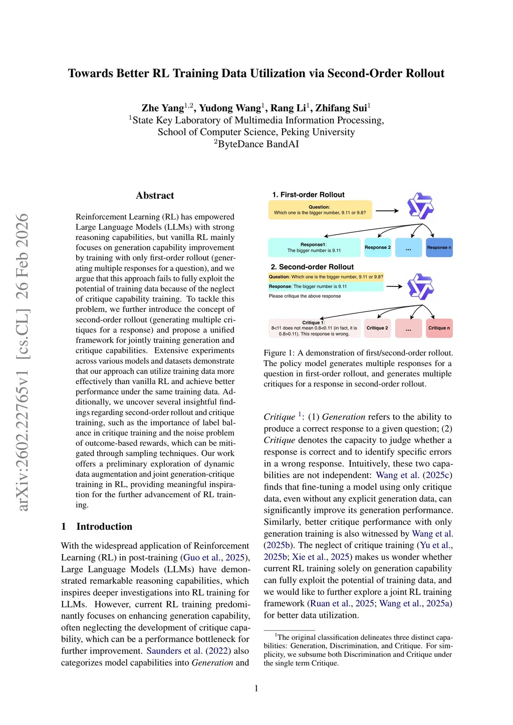 Reinforcement Learning (RL) has empowered Large Language Models (LLMs) with strong reasoning capabilities, but vanilla RL mainly focuses on generation capability improvement by training with only first-order rollout (generating multiple responses for a question), and we argue that this approach fails to fully exploit the potential of training data because of the neglect of critique capability training. To tackle this problem, we further introduce the concept of second-order rollout (generating multiple critiques for a response) and propose a unified framework for jointly training generation and critique capabilities. Extensive experiments across various models and datasets demonstrate that our approach can utilize training data more effectively than vanilla RL and achieve better performance under the same training data. Additionally, we uncover several insightful findings regarding second-order rollout and critique training, such as the importance of label balance in critique training and the noise problem of outcome-based rewards, which can be mitigated through sampling techniques. Our work offers a preliminary exploration of dynamic data augmentation and joint generation-critique training in RL, providing meaningful inspiration for the further advancement of RL training