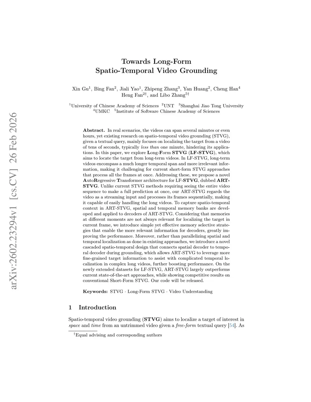 In real scenarios, videos can span several minutes or even hours. However, existing research on spatio-temporal video grounding (STVG), given a textual query, mainly focuses on localizing targets in short videos of tens of seconds, typically less than one minute, which limits real-world applications. In this paper, we explore Long-Form STVG (LF-STVG), which aims to locate targets in long-term videos. Compared with short videos, long-term videos contain much longer temporal spans and more irrelevant information, making it difficult for existing STVG methods that process all frames at once. To address this challenge, we propose an AutoRegressive Transformer architecture for LF-STVG, termed ART-STVG. Unlike conventional STVG methods that require the entire video sequence to make predictions at once, ART-STVG treats the video as streaming input and processes frames sequentially, enabling efficient handling of long videos. To model spatio-temporal context, we design spatial and temporal memory banks and apply them to the decoders. Since memories from different moments are not always relevant to the current frame, we introduce simple yet effective memory selection strategies to provide more relevant information to the decoders, significantly improving performance. Furthermore, instead of parallel spatial and temporal localization, we propose a cascaded spatio-temporal design that connects the spatial decoder to the temporal decoder, allowing fine-grained spatial cues to assist complex temporal localization in long videos. Experiments on newly extended LF-STVG datasets show that ART-STVG significantly outperforms state-of-the-art methods, while achieving competitive performance on conventional short-form STVG.