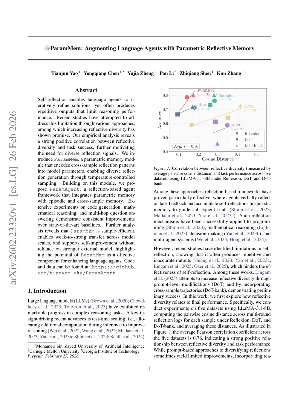 Self-reflection enables language agents to iteratively refine solutions, yet often produces repetitive outputs that limit reasoning performance. Recent studies have attempted to address this limitation through various approaches, among which increasing reflective diversity has shown promise. Our empirical analysis reveals a strong positive correlation between reflective diversity and task success, further motivating the need for diverse reflection signals. We introduce ParamMem, a parametric memory module that encodes cross-sample reflection patterns into model parameters, enabling diverse reflection generation through temperature-controlled sampling. Building on this module, we propose ParamAgent, a reflection-based agent framework that integrates parametric memory with episodic and cross-sample memory. Extensive experiments on code generation, mathematical reasoning, and multi-hop question answering demonstrate consistent improvements over state-of-the-art baselines. Further analysis reveals that ParamMem is sample-efficient, enables weak-to-strong transfer across model scales, and supports self-improvement without reliance on stronger external model, highlighting the potential of ParamMem as an effective component for enhancing language agents.