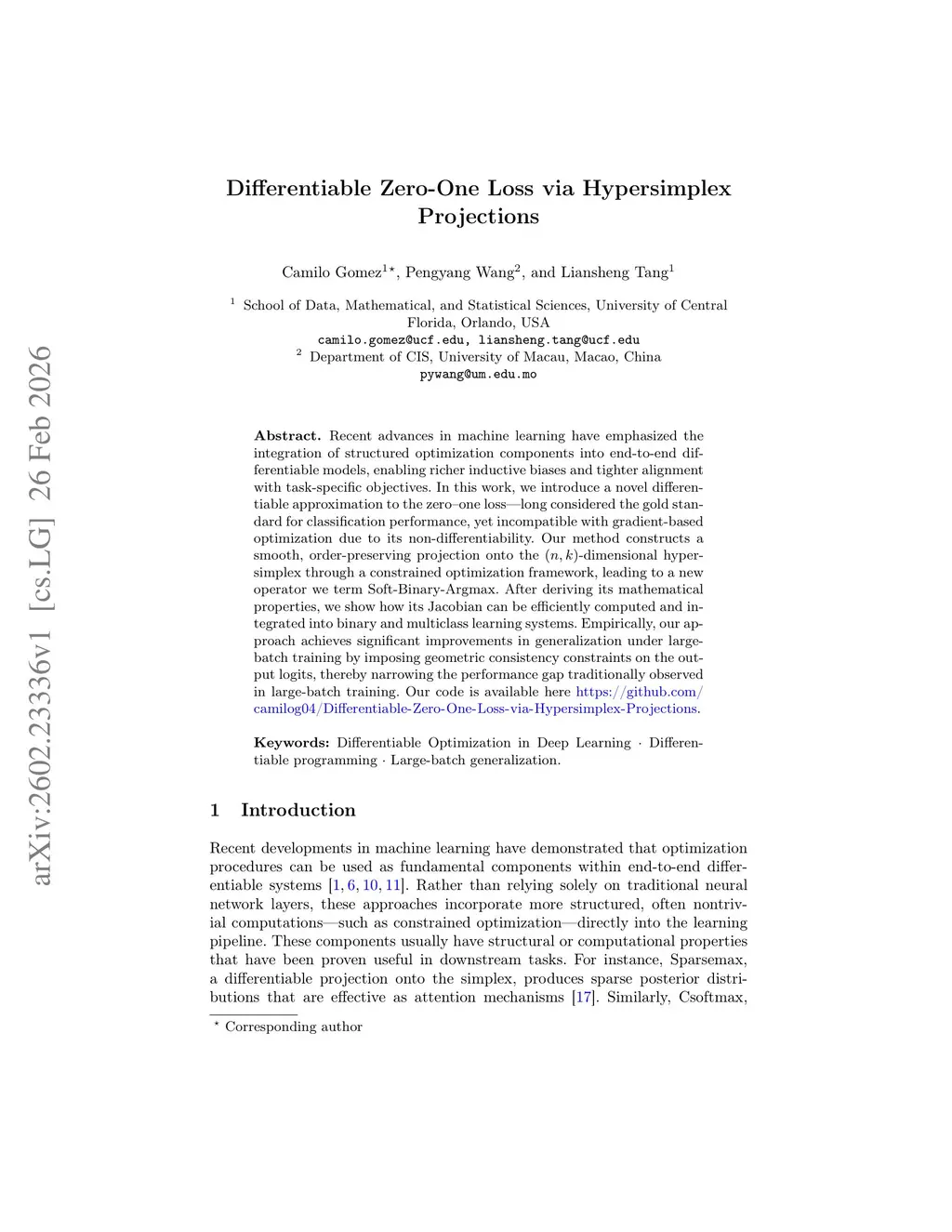 Recent advances in machine learning have emphasized the integration of structured optimization components into end-to-end differentiable models, enabling richer inductive biases and tighter alignment with task-specific objectives. In this work, we introduce a novel differentiable approximation to the zero-one loss-long considered the gold standard for classification performance, yet incompatible with gradient-based optimization due to its non-differentiability. Our method constructs a smooth, order-preserving projection onto the n,k-dimensional hypersimplex through a constrained optimization framework, leading to a new operator we term Soft-Binary-Argmax. After deriving its mathematical properties, we show how its Jacobian can be efficiently computed and integrated into binary and multiclass learning systems. Empirically, our approach achieves significant improvements in generalization under large-batch training by imposing geometric consistency constraints on the output logits, thereby narrowing the performance gap traditionally observed in large-batch training.