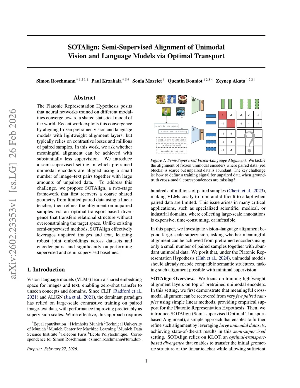 The Platonic Representation Hypothesis posits that neural networks trained on different modalities converge toward a shared statistical model of the world. Recent work exploits this convergence by aligning frozen pretrained vision and language models with lightweight alignment layers, but typically relies on contrastive losses and millions of paired samples. In this work, we ask whether meaningful alignment can be achieved with substantially less supervision. We introduce a semi-supervised setting in which pretrained unimodal encoders are aligned using a small number of image-text pairs together with large amounts of unpaired data. To address this challenge, we propose SOTAlign, a two-stage framework that first recovers a coarse shared geometry from limited paired data using a linear teacher, then refines the alignment on unpaired samples via an optimal-transport-based divergence that transfers relational structure without overconstraining the target space. Unlike existing semi-supervised methods, SOTAlign effectively leverages unpaired images and text, learning robust joint embeddings across datasets and encoder pairs, and significantly outperforming supervised and semi-supervised baselines.