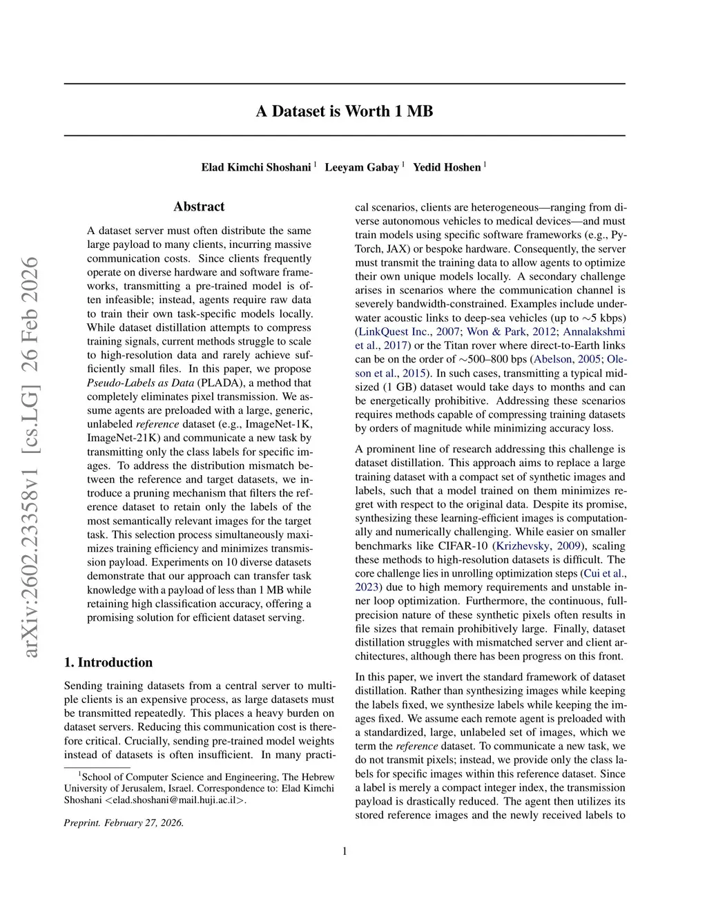 A dataset server must often distribute the same large payload to many clients, incurring massive communication costs. Since clients frequently operate on diverse hardware and software frameworks, transmitting a pre-trained model is often infeasible; instead, agents require raw data to train their own task-specific models locally. While dataset distillation attempts to compress training signals, current methods struggle to scale to high-resolution data and rarely achieve sufficiently small files. In this paper, we propose Pseudo-Labels as Data (PLADA), a method that completely eliminates pixel transmission. We assume agents are preloaded with a large, generic, unlabeled reference dataset (e.g., ImageNet-1K, ImageNet-21K) and communicate a new task by transmitting only the class labels for specific images. To address the distribution mismatch between the reference and target datasets, we introduce a pruning mechanism that filters the reference dataset to retain only the labels of the most semantically relevant images for the target task. This selection process simultaneously maximizes training efficiency and minimizes transmission payload. Experiments on 10 diverse datasets demonstrate that our approach can transfer task knowledge with a payload of less than 1 MB while retaining high classification accuracy, offering a promising solution for efficient dataset serving.