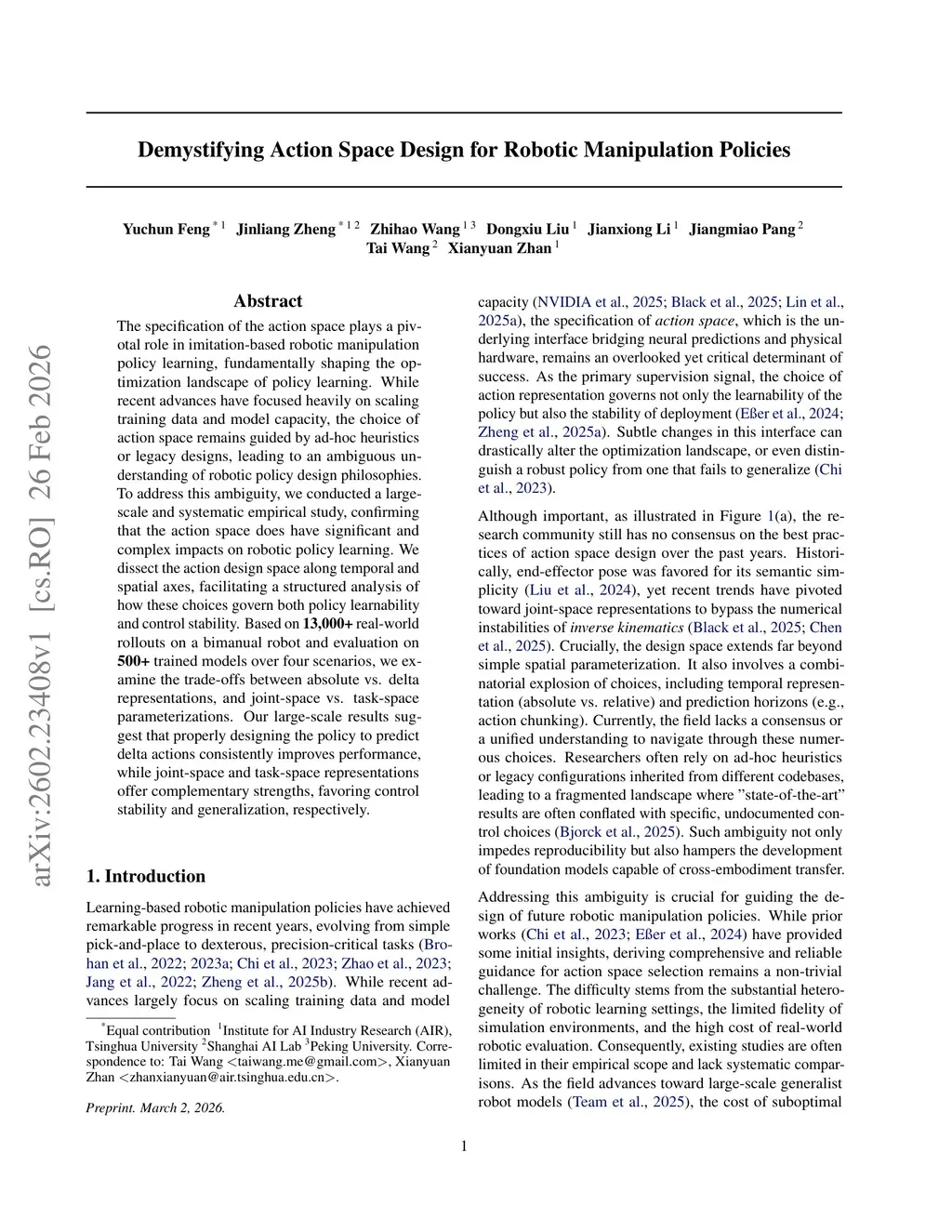The specification of the action space plays a pivotal role in imitation-based robotic manipulation policy learning, fundamentally shaping the optimization landscape of policy learning. While recent advances have focused heavily on scaling training data and model capacity, the choice of action space remains guided by ad-hoc heuristics or legacy designs, leading to an ambiguous understanding of robotic policy design philosophies. To address this ambiguity, we conducted a large-scale and systematic empirical study, confirming that the action space does have significant and complex impacts on robotic policy learning. We dissect the action design space along temporal and spatial axes, facilitating a structured analysis of how these choices govern both policy learnability and control stability. Based on 13,000+ real-world rollouts on a bimanual robot and evaluation on 500+ trained models over four scenarios, we examine the trade-offs between absolute vs. delta representations, and joint-space vs. task-space parameterizations. Our large-scale results suggest that properly designing the policy to predict delta actions consistently improves performance, while joint-space and task-space representations offer complementary strengths, favoring control stability and generalization, respectively.