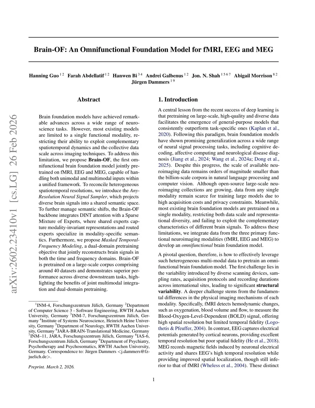 Brain foundation models have achieved remarkable advances across a wide range of neuroscience tasks. However, most existing models are limited to a single functional modality, restricting their ability to exploit complementary spatiotemporal dynamics and the collective data scale across imaging techniques. To address this limitation, we propose Brain-OF, the first omnifunctional brain foundation model jointly pretrained on fMRI, EEG and MEG, capable of handling both unimodal and multimodal inputs within a unified framework. To reconcile heterogeneous spatiotemporal resolutions, we introduce the Any-Resolution Neural Signal Sampler, which projects diverse brain signals into a shared semantic space. To further manage semantic shifts, the Brain-OF backbone integrates DINT attention with a Sparse Mixture of Experts, where shared experts capture modality-invariant representations and routed experts specialize in modality-specific semantics. Furthermore, we propose Masked Temporal-Frequency Modeling, a dual-domain pretraining objective that jointly reconstructs brain signals in both the time and frequency domains. Brain-OF is pretrained on a large-scale corpus comprising around 40 datasets and demonstrates superior performance across diverse downstream tasks, highlighting the benefits of joint multimodal integration and dual-domain pretraining.