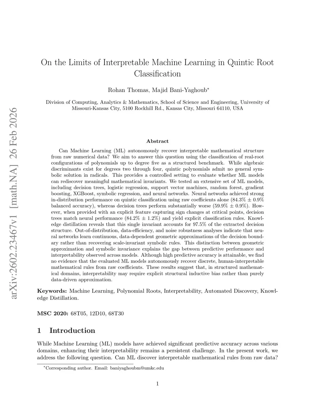 Can Machine Learning (ML) autonomously recover interpretable mathematical structure from raw numerical data? We aim to answer this question using the classification of real-root configurations of polynomials up to degree five as a structured benchmark. We tested an extensive set of ML models, including decision trees, logistic regression, support vector machines, random forest, gradient boosting, XGBoost, symbolic regression, and neural networks. Neural networks achieved strong in-distribution performance on quintic classification using raw coefficients alone (84.3% + or - 0.9% balanced accuracy), whereas decision trees perform substantially worse (59.9% + or - 0.9\%). However, when provided with an explicit feature capturing sign changes at critical points, decision trees match neural performance (84.2% + or - 1.2%) and yield explicit classification rules. Knowledge distillation reveals that this single invariant accounts for 97.5% of the extracted decision structure. Out-of-distribution, data-efficiency, and noise robustness analyses indicate that neural networks learn continuous, data-dependent geometric approximations of the decision boundary rather than recovering scale-invariant symbolic rules. This distinction between geometric approximation and symbolic invariance explains the gap between predictive performance and interpretability observed across models. Although high predictive accuracy is attainable, we find no evidence that the evaluated ML models autonomously recover discrete, human-interpretable mathematical rules from raw coefficients. These results suggest that, in structured mathematical domains, interpretability may require explicit structural inductive bias rather than purely data-driven approximation.