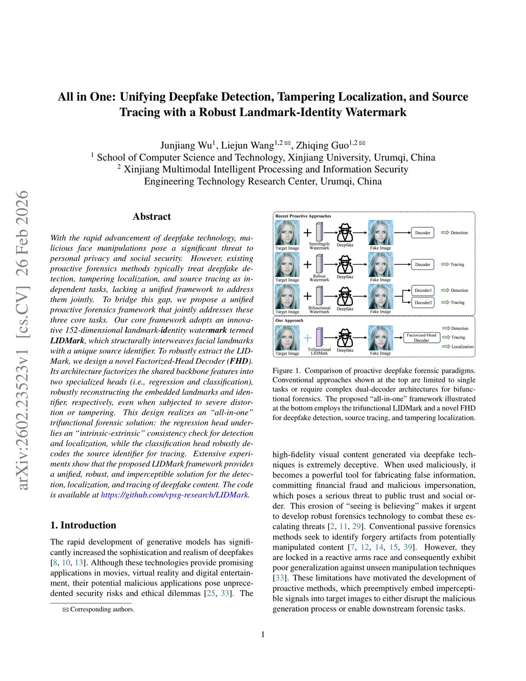 With the rapid advancement of deepfake technology, malicious face manipulations pose a significant threat to personal privacy and social security. However, existing proactive forensics methods typically treat deepfake detection, tampering localization, and source tracing as independent tasks, lacking a unified framework to address them jointly. To bridge this gap, we propose a unified proactive forensics framework that jointly addresses these three core tasks. Our core framework adopts an innovative 152-dimensional landmark-identity watermark termed LIDMark, which structurally interweaves facial landmarks with a unique source identifier. To robustly extract the LIDMark, we design a novel Factorized-Head Decoder (FHD). Its architecture factorizes the shared backbone features into two specialized heads (i.e., regression and classification), robustly reconstructing the embedded landmarks and identifier, respectively, even when subjected to severe distortion or tampering. This design realizes an "all-in-one" trifunctional forensic solution: the regression head underlies an "intrinsic-extrinsic" consistency check for detection and localization, while the classification head robustly decodes the source identifier for tracing. Extensive experiments show that the proposed LIDMark framework provides a unified, robust, and imperceptible solution for the detection, localization, and tracing of deepfake content. The code is available atthis https URL.