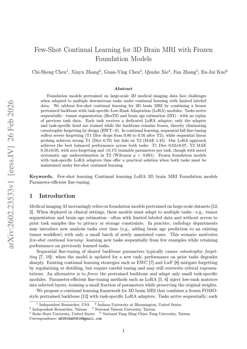 Few-Shot Continual Learning for 3D Brain MRI with Frozen Foundation Models