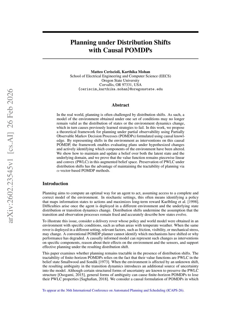 In the real world, planning is often challenged by distribution shifts. As such, a model of the environment obtained under one set of conditions may no longer remain valid as the distribution of states or the environment dynamics change, which in turn causes previously learned strategies to fail. In this work, we propose a theoretical framework for planning under partial observability using Partially Observable Markov Decision Processes (POMDPs) formulated using causal knowledge. By representing shifts in the environment as interventions on this causal POMDP, the framework enables evaluating plans under hypothesized changes and actively identifying which components of the environment have been altered. We show how to maintain and update a belief over both the latent state and the underlying domain, and we prove that the value function remains piecewise linear and convex (PWLC) in this augmented belief space. Preservation of PWLC under distribution shifts has the advantage of maintaining the tractability of planning via -vector-based POMDP methods.