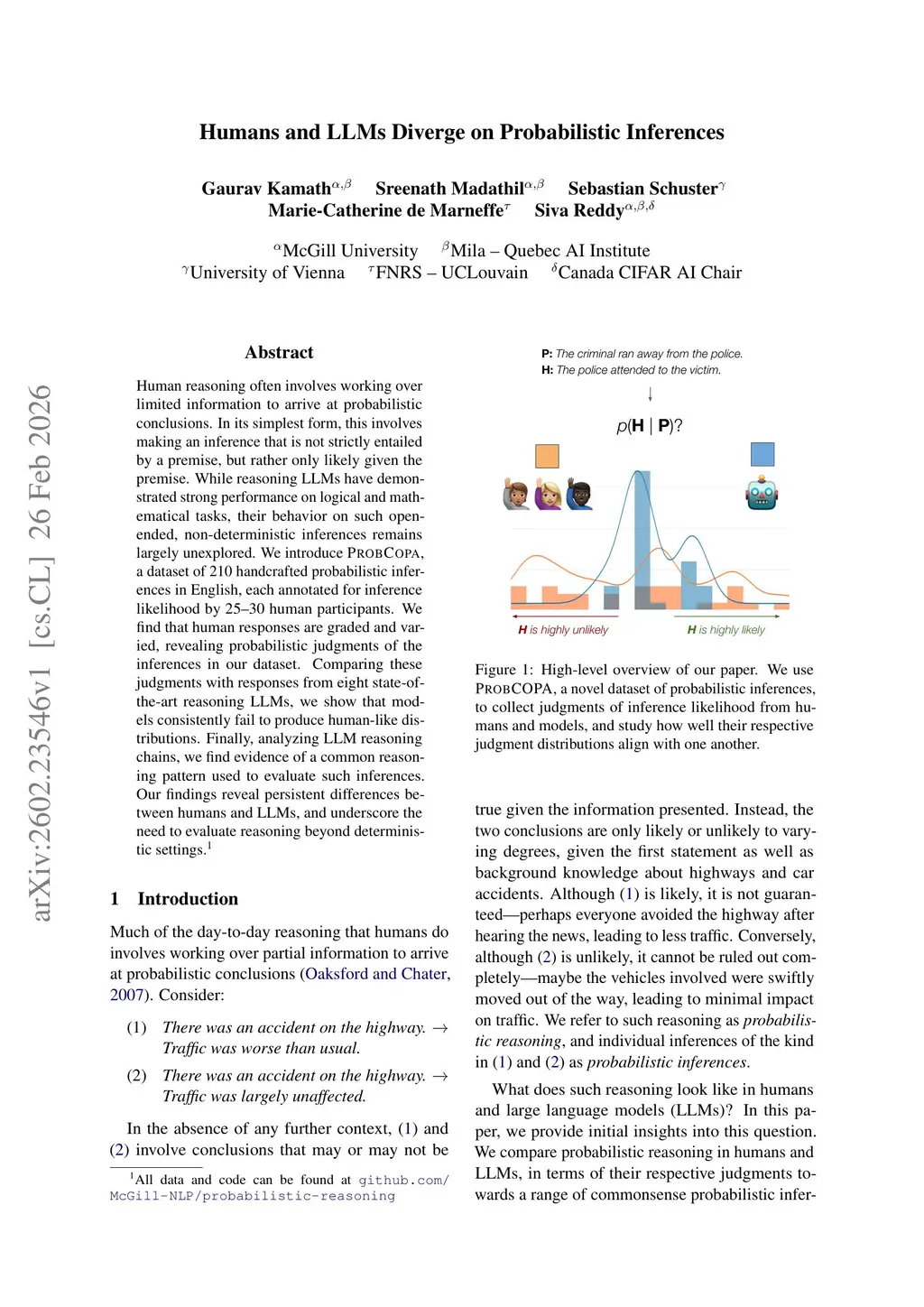 Human reasoning often involves working over limited information to arrive at probabilistic conclusions. In its simplest form, this involves making an inference that is not strictly entailed by a premise, but rather only likely given the premise. While reasoning LLMs have demonstrated strong performance on logical and mathematical tasks, their behavior on such open-ended, non-deterministic inferences remains largely unexplored. We introduce ProbCOPA, a dataset of 210 handcrafted probabilistic inferences in English, each annotated for inference likelihood by 25--30 human participants. We find that human responses are graded and varied, revealing probabilistic judgments of the inferences in our dataset. Comparing these judgments with responses from eight state-of-the-art reasoning LLMs, we show that models consistently fail to produce human-like distributions. Finally, analyzing LLM reasoning chains, we find evidence of a common reasoning pattern used to evaluate such inferences. Our findings reveal persistent differences between humans and LLMs, and underscore the need to evaluate reasoning beyond deterministic settings.