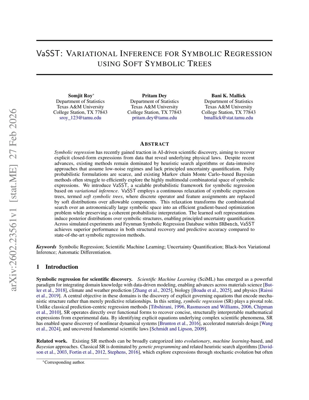 Symbolic regression has recently gained traction in AI-driven scientific discovery, aiming to recover explicit closed-form expressions from data that reveal underlying physical laws. Despite recent advances, existing methods remain dominated by heuristic search algorithms or data-intensive approaches that assume low-noise regimes and lack principled uncertainty quantification. Fully probabilistic formulations are scarce, and existing Markov chain Monte Carlo-based Bayesian methods often struggle to efficiently explore the highly multimodal combinatorial space of symbolic expressions. We introduce VaSST, a scalable probabilistic framework for symbolic regression based on variational inference. VaSST employs a continuous relaxation of symbolic expression trees, termed soft symbolic trees, where discrete operator and feature assignments are replaced by soft distributions over allowable components. This relaxation transforms the combinatorial search over an astronomically large symbolic space into an efficient gradient-based optimization problem while preserving a coherent probabilistic interpretation. The learned soft representations induce posterior distributions over symbolic structures, enabling principled uncertainty quantification. Across simulated experiments and Feynman Symbolic Regression Database within SRBench, VaSST achieves superior performance in both structural recovery and predictive accuracy compared to state-of-the-art symbolic regression methods.