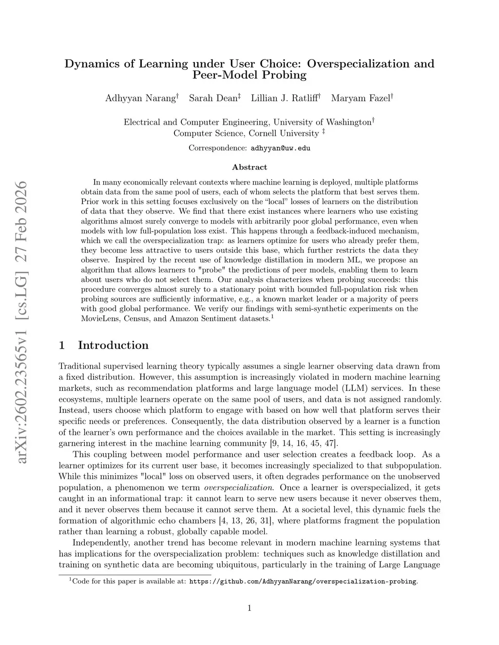 In many economically relevant contexts where machine learning is deployed, multiple platforms obtain data from the same pool of users, each of whom selects the platform that best serves them. Prior work in this setting focuses exclusively on the "local" losses of learners on the distribution of data that they observe. We find that there exist instances where learners who use existing algorithms almost surely converge to models with arbitrarily poor global performance, even when models with low full-population loss exist. This happens through a feedback-induced mechanism, which we call the overspecialization trap: as learners optimize for users who already prefer them, they become less attractive to users outside this base, which further restricts the data they observe. Inspired by the recent use of knowledge distillation in modern ML, we propose an algorithm that allows learners to "probe" the predictions of peer models, enabling them to learn about users who do not select them. Our analysis characterizes when probing succeeds: this procedure converges almost surely to a stationary point with bounded full-population risk when probing sources are sufficiently informative, e.g., a known market leader or a majority of peers with good global performance. We verify our findings with semi-synthetic experiments on the MovieLens, Census, and Amazon Sentiment datasets.