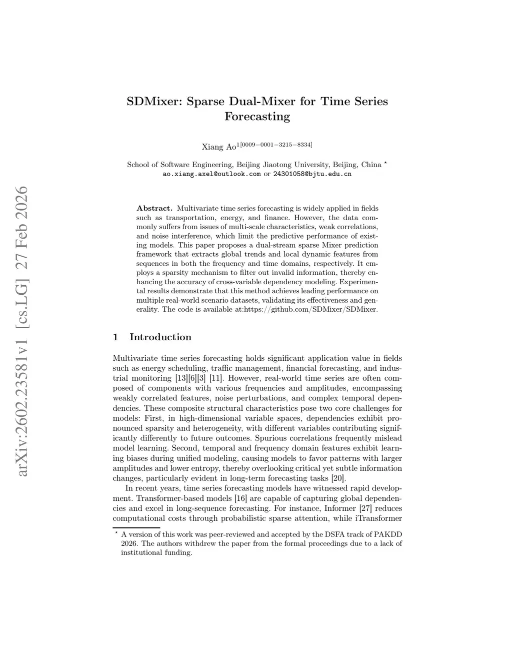 Multivariate time series forecasting is widely applied in fields such as transportation, energy, and finance. However, the data commonly suffers from issues of multi-scale characteristics, weak correlations, and noise interference, which limit the predictive performance of existing models. This paper proposes a dual-stream sparse Mixer prediction framework that extracts global trends and local dynamic features from sequences in both the frequency and time domains, respectively. It employs a sparsity mechanism to filter out invalid information, thereby enhancing the accuracy of cross-variable dependency modeling. Experimental results demonstrate that this method achieves leading performance on multiple real-world scenario datasets, validating its effectiveness and generality. The code is available atthis https URL