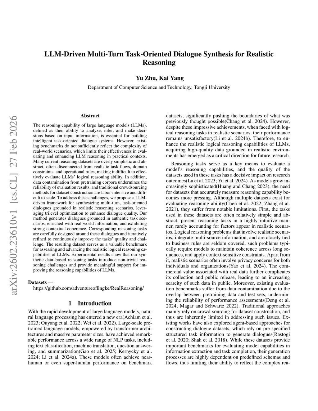 The reasoning capability of large language models (LLMs), defined as their ability to analyze, infer, and make decisions based on input information, is essential for building intelligent task-oriented dialogue systems. However, existing benchmarks do not sufficiently reflect the complexity of real-world scenarios, which limits their effectiveness in evaluating and enhancing LLM reasoning in practical contexts. Many current reasoning datasets are overly simplistic and abstract, often disconnected from realistic task flows, domain constraints, and operational rules, making it difficult to effectively evaluate LLMs' logical reasoning ability. In addition, data contamination from pretraining corpora undermines the reliability of evaluation results, and traditional crowdsourcing methods for dataset construction are labor-intensive and difficult to scale. To address these challenges, we propose a LLM-driven framework for synthesizing multi-turn, task-oriented dialogues grounded in realistic reasoning scenarios, leveraging trilevel optimization to enhance dialogue quality. Our method generates dialogues grounded in authentic task scenarios, enriched with real-world information, and exhibiting strong contextual coherence. Corresponding reasoning tasks are carefully designed around these dialogues and iteratively refined to continuously improve the tasks' quality and challenge. The resulting dataset serves as a valuable benchmark for assessing and advancing the realistic logical reasoning capabilities of LLMs. Experimental results show that our synthetic data-based reasoning tasks introduce non-trivial reasoning challenges and provide meaningful support for improving the reasoning capabilities of LLMs.