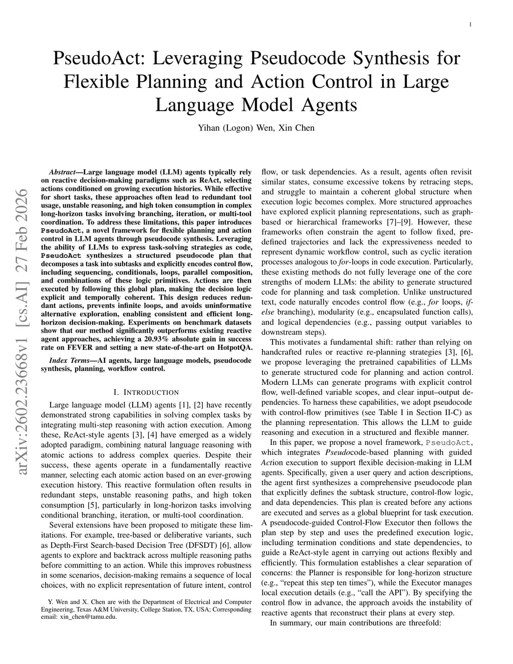 PseudoAct: Leveraging Pseudocode Synthesis for Flexible Planning and Action Control in Large Language Model Agents