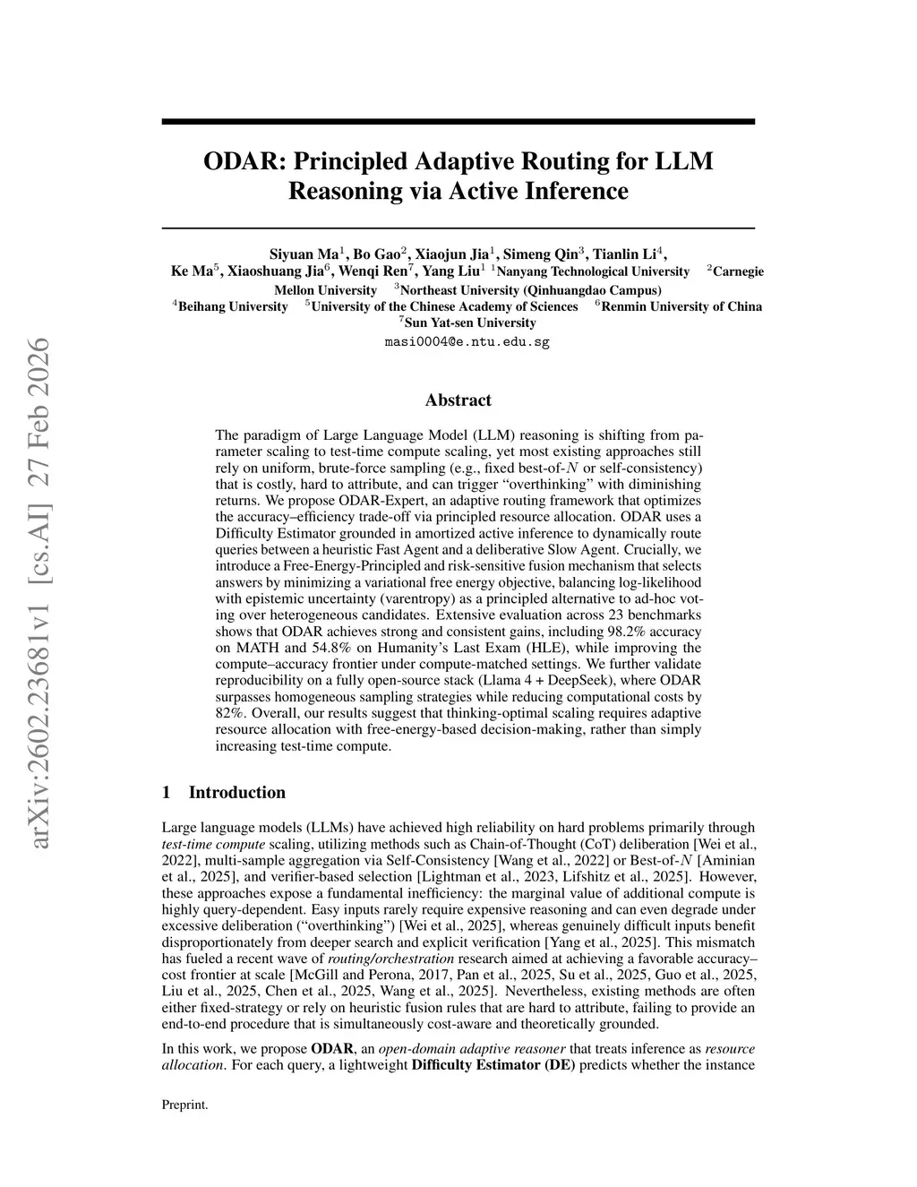 The paradigm of large language model (LLM) reasoning is shifting from parameter scaling to test-time compute scaling, yet many existing approaches still rely on uniform brute-force sampling (for example, fixed best-of-N or self-consistency) that is costly, hard to attribute, and can trigger overthinking with diminishing returns. We propose ODAR-Expert, an adaptive routing framework that optimizes the accuracy-efficiency trade-off via principled resource allocation. ODAR uses a difficulty estimator grounded in amortized active inference to dynamically route queries between a heuristic Fast Agent and a deliberative Slow Agent. We further introduce a free-energy-principled, risk-sensitive fusion mechanism that selects answers by minimizing a variational free energy objective, balancing log-likelihood with epistemic uncertainty (varentropy) as a principled alternative to ad hoc voting over heterogeneous candidates. Extensive evaluation across 23 benchmarks shows strong and consistent gains, including 98.2% accuracy on MATH and 54.8% on Humanity's Last Exam (HLE), while improving the compute-accuracy frontier under compute-matched settings. We also validate reproducibility on a fully open-source stack (Llama 4 + DeepSeek), where ODAR surpasses homogeneous sampling strategies while reducing computational costs by 82%. Overall, our results suggest that thinking-optimal scaling requires adaptive resource allocation with free-energy-based decision-making rather than simply increasing test-time compute.