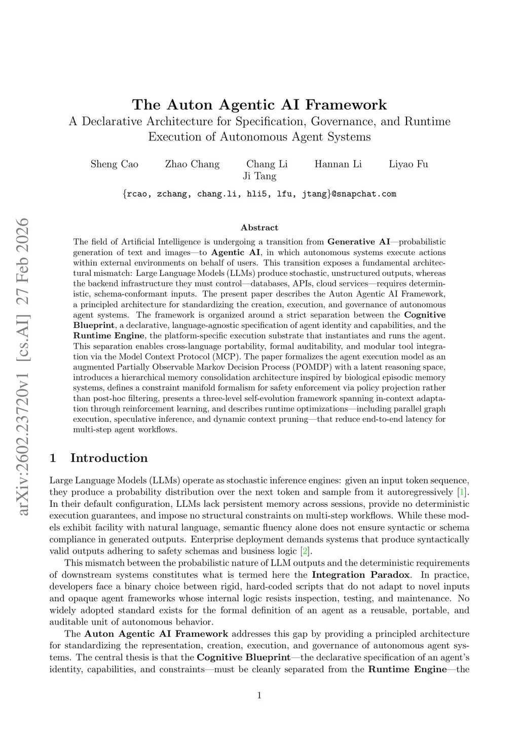 The field of Artificial Intelligence is undergoing a transition from Generative AI -- probabilistic generation of text and images -- to Agentic AI, in which autonomous systems execute actions within external environments on behalf of users. This transition exposes a fundamental architectural mismatch: Large Language Models (LLMs) produce stochastic, unstructured outputs, whereas the backend infrastructure they must control -- databases, APIs, cloud services -- requires deterministic, schema-conformant inputs. The present paper describes the Auton Agentic AI Framework, a principled architecture for standardizing the creation, execution, and governance of autonomous agent systems. The framework is organized around a strict separation between the Cognitive Blueprint, a declarative, language-agnostic specification of agent identity and capabilities, and the Runtime Engine, the platform-specific execution substrate that instantiates and runs the agent. This separation enables cross-language portability, formal auditability, and modular tool integration via the Model Context Protocol (MCP). The paper formalizes the agent execution model as an augmented Partially Observable Markov Decision Process (POMDP) with a latent reasoning space, introduces a hierarchical memory consolidation architecture inspired by biological episodic memory systems, defines a constraint manifold formalism for safety enforcement via policy projection rather than post-hoc filtering, presents a three-level self-evolution framework spanning in-context adaptation through reinforcement learning, and describes runtime optimizations -- including parallel graph execution, speculative inference, and dynamic context pruning -- that reduce end-to-end latency for multi-step agent workflows.