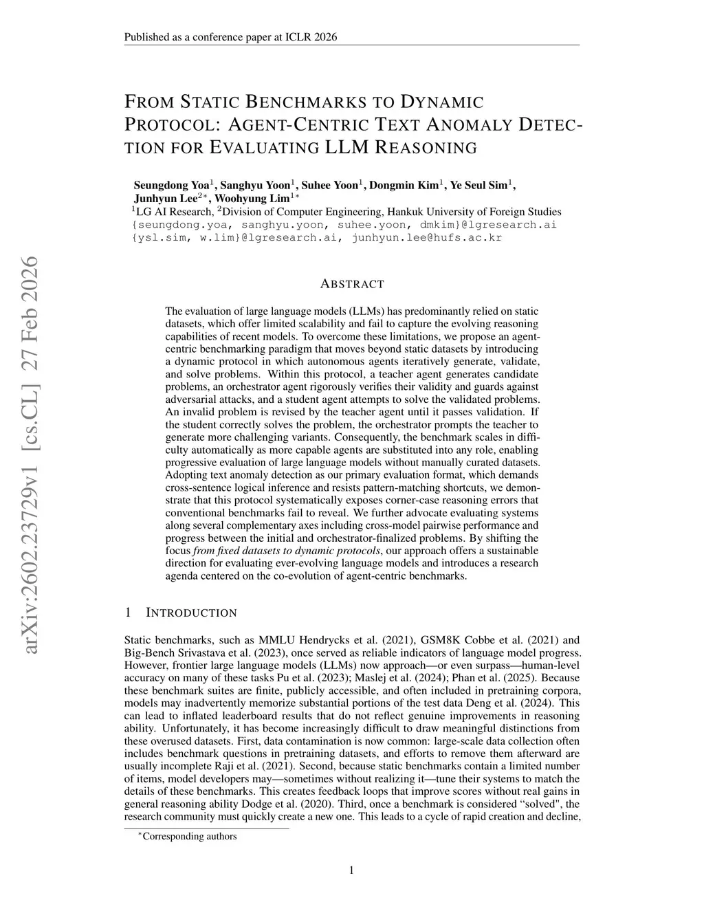 The evaluation of large language models (LLMs) has predominantly relied on static datasets, which offer limited scalability and fail to capture the evolving reasoning capabilities of recent models. To overcome these limitations, we propose an agent-centric benchmarking paradigm that moves beyond static datasets by introducing a dynamic protocol in which autonomous agents iteratively generate, validate, and solve problems. Within this protocol, a teacher agent generates candidate problems, an orchestrator agent rigorously verifies their validity and guards against adversarial attacks, and a student agent attempts to solve the validated problems. An invalid problem is revised by the teacher agent until it passes validation. If the student correctly solves the problem, the orchestrator prompts the teacher to generate more challenging variants. Consequently, the benchmark scales in difficulty automatically as more capable agents are substituted into any role, enabling progressive evaluation of large language models without manually curated datasets. Adopting text anomaly detection as our primary evaluation format, which demands cross-sentence logical inference and resists pattern-matching shortcuts, we demonstrate that this protocol systematically exposes corner-case reasoning errors that conventional benchmarks fail to reveal. We further advocate evaluating systems along several complementary axes including cross-model pairwise performance and progress between the initial and orchestrator-finalized problems. By shifting the focus from fixed datasets to dynamic protocols, our approach offers a sustainable direction for evaluating ever-evolving language models and introduces a research agenda centered on the co-evolution of agent-centric benchmarks.