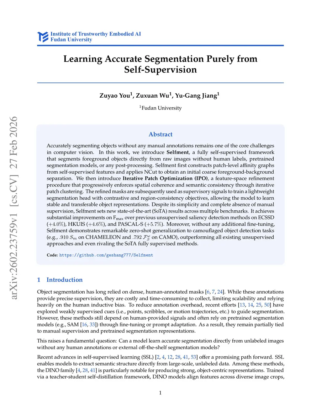 Accurately segmenting objects without any manual annotations remains one of the core challenges in computer vision. In this work, we introduce Selfment, a fully self-supervised framework that segments foreground objects directly from raw images without human labels, pretrained segmentation models, or any post-processing. Selfment first constructs patch-level affinity graphs from self-supervised features and applies NCut to obtain an initial coarse foreground--background separation. We then introduce Iterative Patch Optimization (IPO), a feature-space refinement procedure that progressively enforces spatial coherence and semantic consistency through iterative patch clustering. The refined masks are subsequently used as supervisory signals to train a lightweight segmentation head with contrastive and region-consistency objectives, allowing the model to learn stable and transferable object representations. Despite its simplicity and complete absence of manual supervision, Selfment sets new state-of-the-art (SoTA) results across multiple benchmarks. It achieves substantial improvements on over previous unsupervised saliency detection methods on ECSSD (), HKUIS (), and PASCAL-S (). Moreover, without any additional fine-tuning, Selfment demonstrates remarkable zero-shot generalization to camouflaged object detection tasks (e.g., on CHAMELEON and on CAMO), outperforming all existing unsupervised approaches and even rivaling the SoTA fully supervised methods.