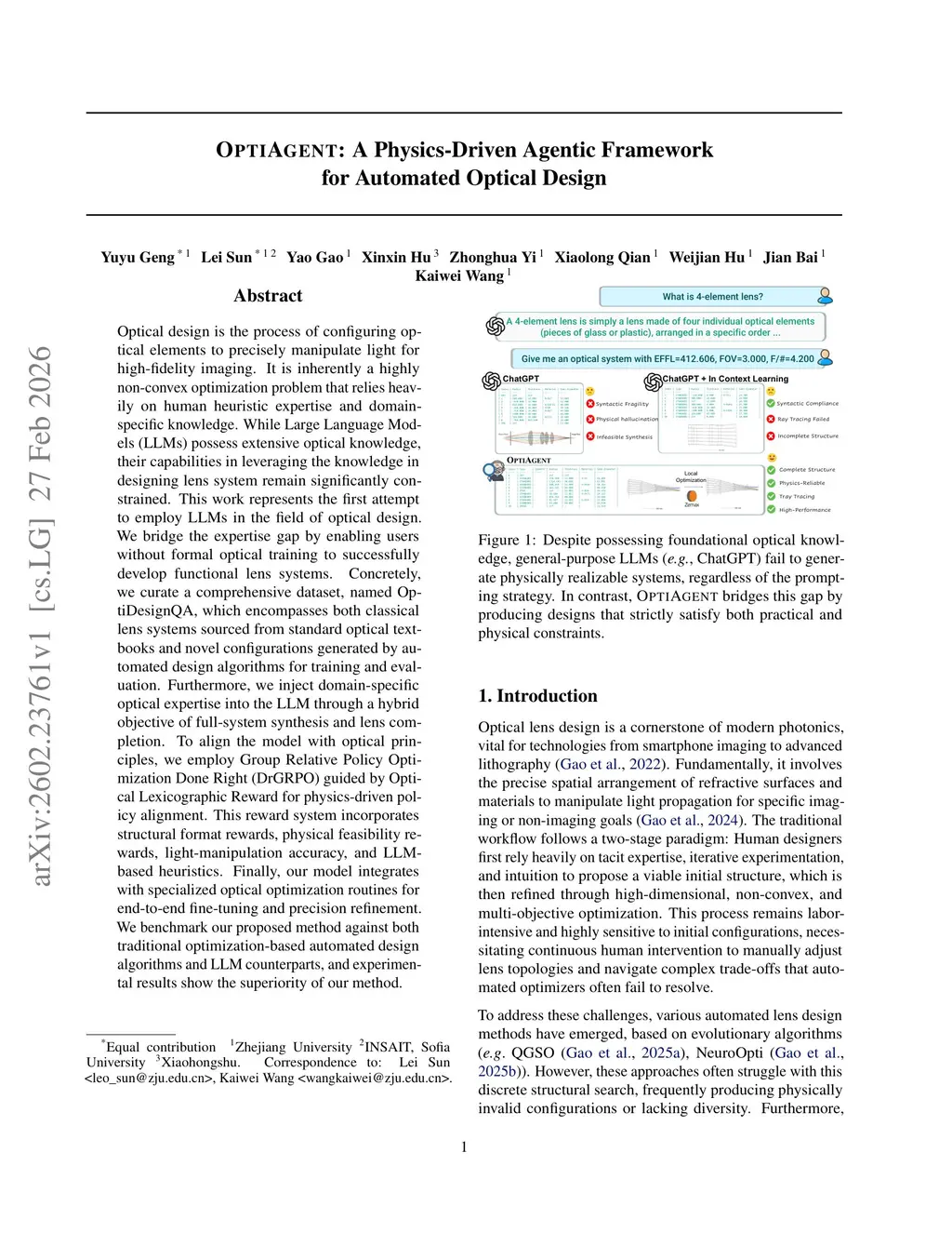 Optical design is the process of configuring optical elements to precisely manipulate light for high-fidelity imaging. It is inherently a highly non-convex optimization problem that relies heavily on human heuristic expertise and domain-specific knowledge. While Large Language Models (LLMs) possess extensive optical knowledge, their capabilities in leveraging the knowledge in designing lens system remain significantly constrained. This work represents the first attempt to employ LLMs in the field of optical design. We bridge the expertise gap by enabling users without formal optical training to successfully develop functional lens systems. Concretely, we curate a comprehensive dataset, named OptiDesignQA, which encompasses both classical lens systems sourced from standard optical textbooks and novel configurations generated by automated design algorithms for training and evaluation. Furthermore, we inject domain-specific optical expertise into the LLM through a hybrid objective of full-system synthesis and lens completion. To align the model with optical principles, we employ Group Relative Policy Optimization Done Right (DrGRPO) guided by Optical Lexicographic Reward for physics-driven policy alignment. This reward system incorporates structural format rewards, physical feasibility rewards, light-manipulation accuracy, and LLM-based heuristics. Finally, our model integrates with specialized optical optimization routines for end-to-end fine-tuning and precision refinement. We benchmark our proposed method against both traditional optimization-based automated design algorithms and LLM counterparts, and experimental results show the superiority of our method.