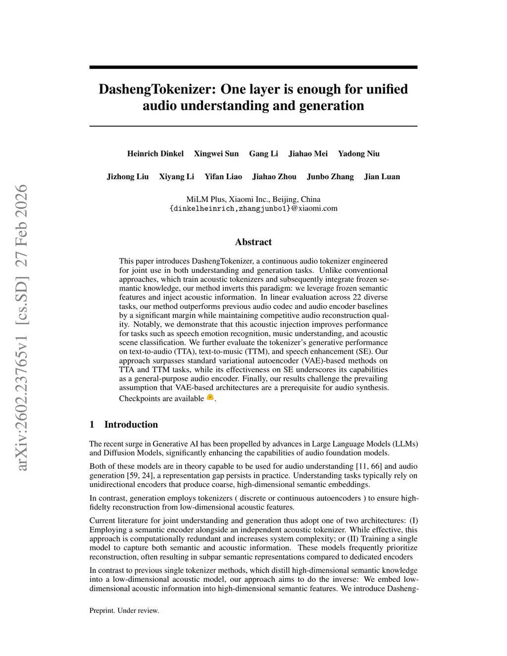DashengTokenizer: One layer is enough for unified audio understanding and generation