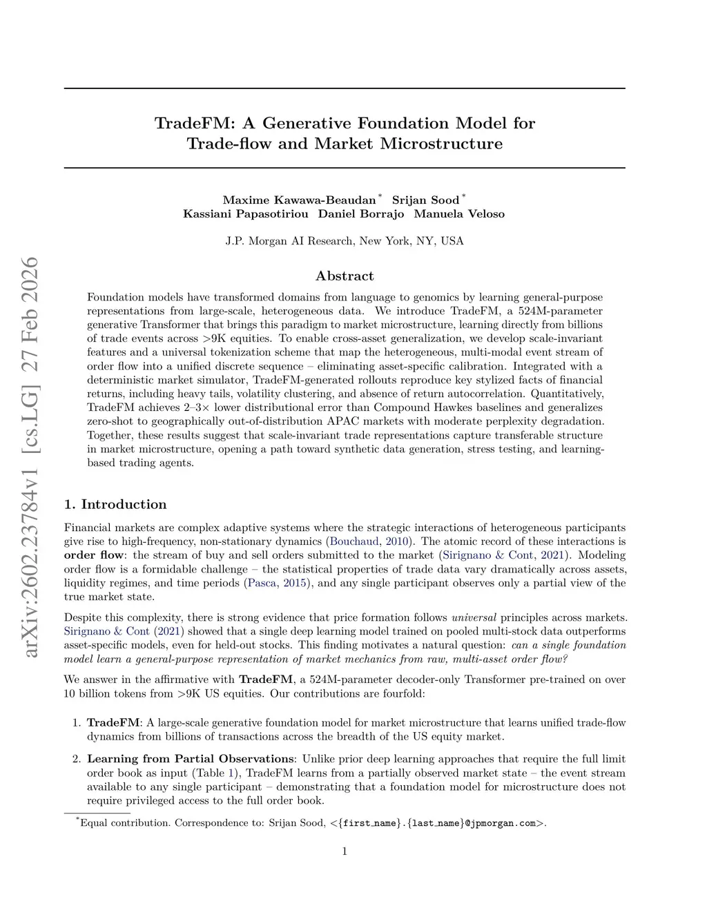 Foundation models have transformed domains from language to genomics by learning general-purpose representations from large-scale, heterogeneous data. We introduce TradeFM, a 524M-parameter generative Transformer that brings this paradigm to market microstructure, learning directly from billions of trade events across >9K equities. To enable cross-asset generalization, we develop scale-invariant features and a universal tokenization scheme that map the heterogeneous, multi-modal event stream of order flow into a unified discrete sequence -- eliminating asset-specific calibration. Integrated with a deterministic market simulator, TradeFM-generated rollouts reproduce key stylized facts of financial returns, including heavy tails, volatility clustering, and absence of return autocorrelation. Quantitatively, TradeFM achieves 2-3x lower distributional error than Compound Hawkes baselines and generalizes zero-shot to geographically out-of-distribution APAC markets with moderate perplexity degradation. Together, these results suggest that scale-invariant trade representations capture transferable structure in market microstructure, opening a path toward synthetic data generation, stress testing, and learning-based trading agents.