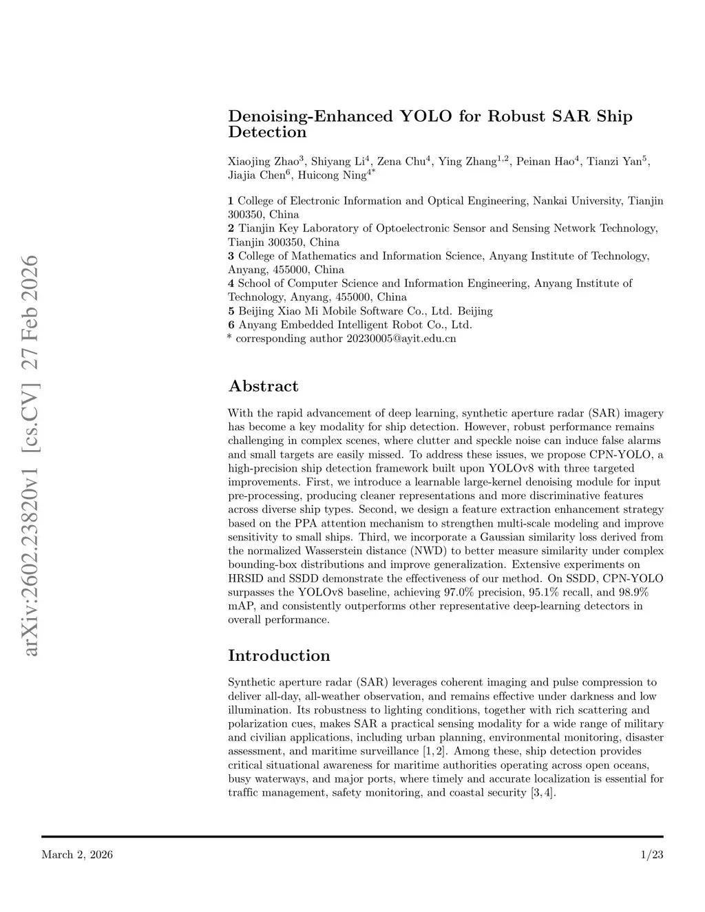 With the rapid advancement of deep learning, synthetic aperture radar (SAR) imagery has become a key modality for ship detection. However, robust performance remains challenging in complex scenes, where clutter and speckle noise can induce false alarms and small targets are easily missed. To address these issues, we propose CPN-YOLO, a high-precision ship detection framework built upon YOLOv8 with three targeted improvements. First, we introduce a learnable large-kernel denoising module for input pre-processing, producing cleaner representations and more discriminative features across diverse ship types. Second, we design a feature extraction enhancement strategy based on the PPA attention mechanism to strengthen multi-scale modeling and improve sensitivity to small ships. Third, we incorporate a Gaussian similarity loss derived from the normalized Wasserstein distance (NWD) to better measure similarity under complex bounding-box distributions and improve generalization. Extensive experiments on HRSID and SSDD demonstrate the effectiveness of our method. On SSDD, CPN-YOLO surpasses the YOLOv8 baseline, achieving 97.0% precision, 95.1% recall, and 98.9% mAP, and consistently outperforms other representative deep-learning detectors in overall performance.