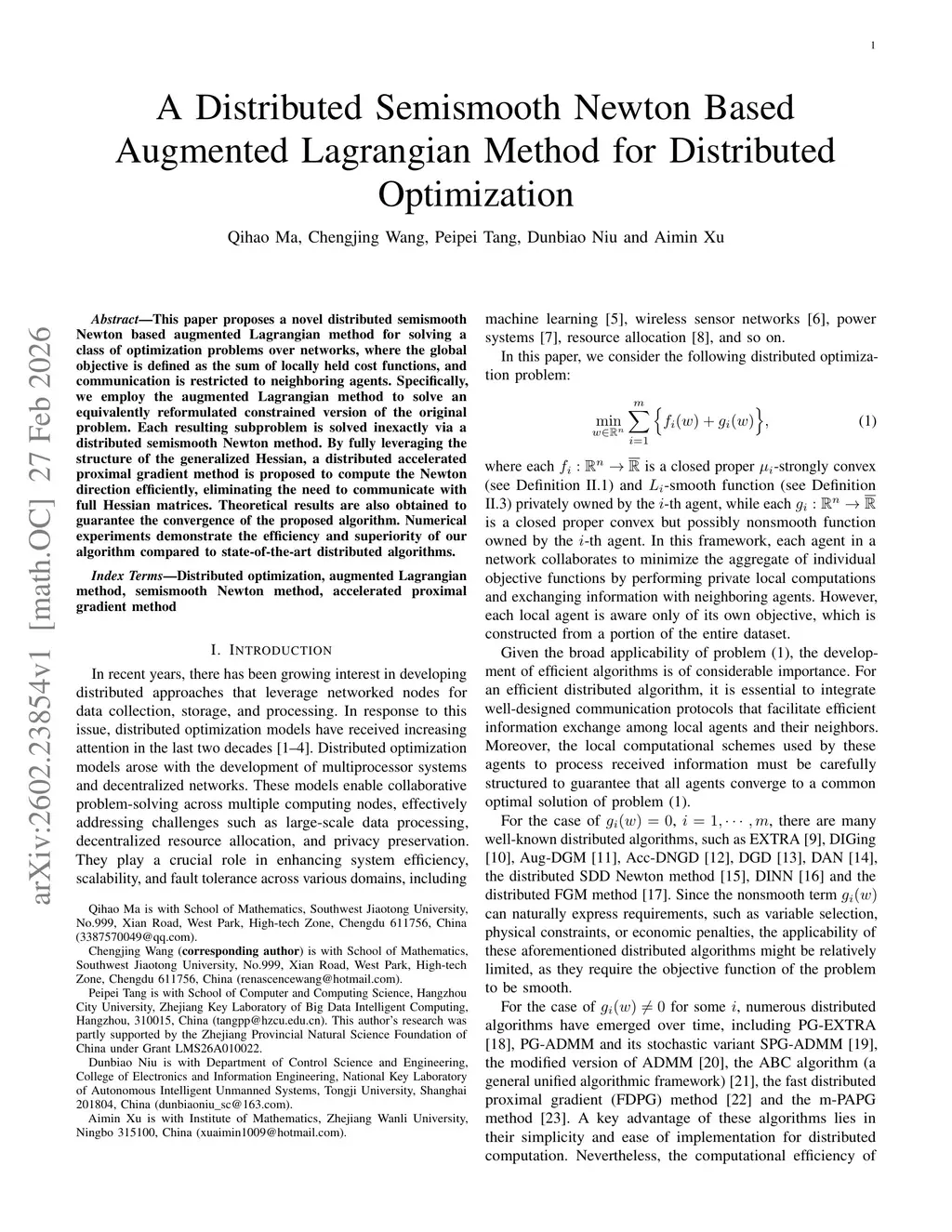 This paper proposes a novel distributed semismooth Newton based augmented Lagrangian method for solving a class of optimization problems over networks, where the global objective is defined as the sum of locally held cost functions, and communication is restricted to neighboring agents. Specifically, we employ the augmented Lagrangian method to solve an equivalently reformulated constrained version of the original problem. Each resulting subproblem is solved inexactly via a distributed semismooth Newton method. By fully leveraging the structure of the generalized Hessian, a distributed accelerated proximal gradient method is proposed to compute the Newton direction efficiently, eliminating the need to communicate with full Hessian matrices. Theoretical results are also obtained to guarantee the convergence of the proposed algorithm. Numerical experiments demonstrate the efficiency and superiority of our algorithm compared to state-of-the-art distributed algorithms.