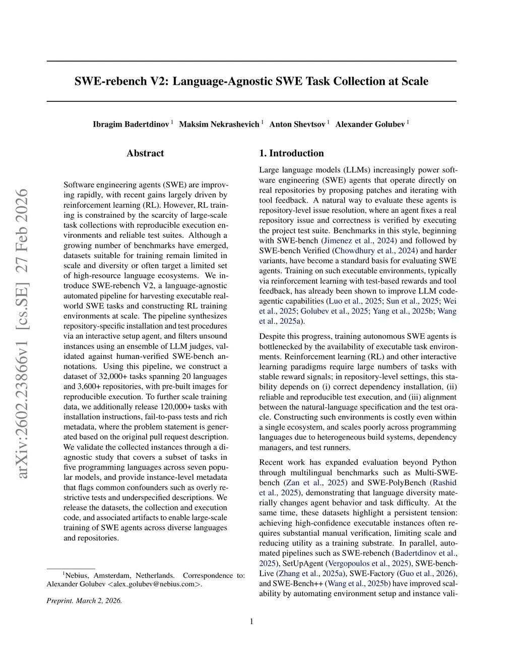 Software engineering agents (SWE) are improving rapidly, with recent gains largely driven by reinforcement learning (RL). However, RL training is constrained by the scarcity of large-scale task collections with reproducible execution environments and reliable test suites. Although a growing number of benchmarks have emerged, datasets suitable for training remain limited in scale and diversity or often target a limited set of high-resource language ecosystems. We introduce SWE-rebench V2, a language-agnostic automated pipeline for harvesting executable real-world SWE tasks and constructing RL training environments at scale. The pipeline synthesizes repository-specific installation and test procedures via an interactive setup agent, and filters unsound instances using an ensemble of LLM judges, validated against human-verified SWE-bench annotations. Using this pipeline, we construct a dataset of 32,000+ tasks spanning 20 languages and 3,600+ repositories, with pre-built images for reproducible execution. To further scale training data, we additionally release 120,000+ tasks with installation instructions, fail-to-pass tests and rich metadata, where the problem statement is generated based on the original pull request description. We validate the collected instances through a diagnostic study that covers a subset of tasks in five programming languages across seven popular models, and provide instance-level metadata that flags common confounders such as overly restrictive tests and underspecified descriptions. We release the datasets, the collection and execution code, and associated artifacts to enable large-scale training of SWE agents across diverse languages and repositories.