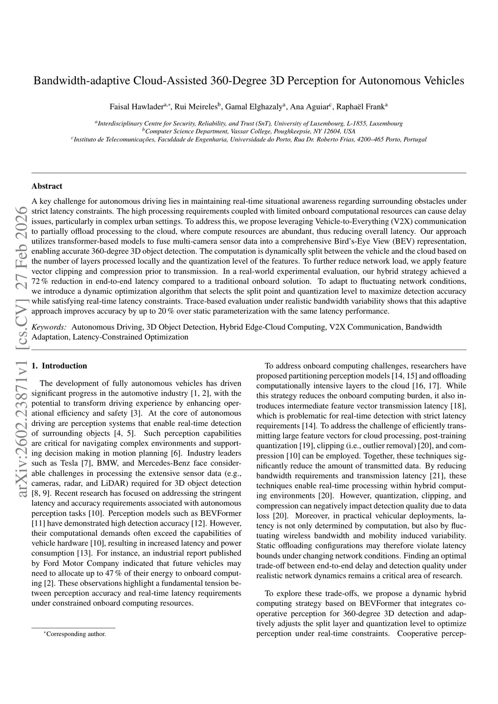A key challenge for autonomous driving lies in maintaining real-time situational awareness regarding surrounding obstacles under strict latency constraints. The high processing requirements coupled with limited onboard computational resources can cause delay issues, particularly in complex urban settings. To address this, we propose leveraging Vehicle-to-Everything (V2X) communication to partially offload processing to the cloud, where compute resources are abundant, thus reducing overall latency. Our approach utilizes transformer-based models to fuse multi-camera sensor data into a comprehensive Bird's-Eye View (BEV) representation, enabling accurate 360-degree 3D object detection. The computation is dynamically split between the vehicle and the cloud based on the number of layers processed locally and the quantization level of the features. To further reduce network load, we apply feature vector clipping and compression prior to transmission. In a real-world experimental evaluation, our hybrid strategy achieved a 72 \% reduction in end-to-end latency compared to a traditional onboard solution. To adapt to fluctuating network conditions, we introduce a dynamic optimization algorithm that selects the split point and quantization level to maximize detection accuracy while satisfying real-time latency constraints. Trace-based evaluation under realistic bandwidth variability shows that this adaptive approach improves accuracy by up to 20 \% over static parameterization with the same latency performance.