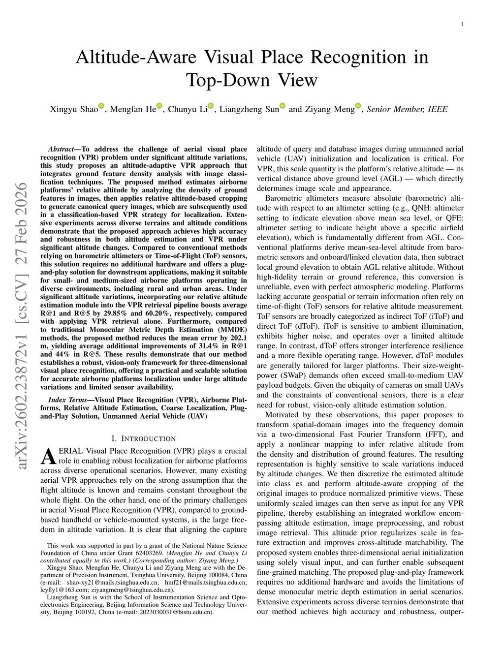 To address the challenge of aerial visual place recognition (VPR) problem under significant altitude variations, this study proposes an altitude-adaptive VPR approach that integrates ground feature density analysis with image classification techniques. The proposed method estimates airborne platforms' relative altitude by analyzing the density of ground features in images, then applies relative altitude-based cropping to generate canonical query images, which are subsequently used in a classification-based VPR strategy for localization. Extensive experiments across diverse terrains and altitude conditions demonstrate that the proposed approach achieves high accuracy and robustness in both altitude estimation and VPR under significant altitude changes. Compared to conventional methods relying on barometric altimeters or Time-of-Flight (ToF) sensors, this solution requires no additional hardware and offers a plug-and-play solution for downstream applications, {making it suitable for small- and medium-sized airborne platforms operating in diverse environments, including rural and urban areas.} Under significant altitude variations, incorporating our relative altitude estimation module into the VPR retrieval pipeline boosts average R@1 and R@5 by 29.85\% and 60.20\%, respectively, compared with applying VPR retrieval alone. Furthermore, compared to traditional {Monocular Metric Depth Estimation (MMDE) methods}, the proposed method reduces the mean error by 202.1 m, yielding average additional improvements of 31.4\% in R@1 and 44\% in R@5. These results demonstrate that our method establishes a robust, vision-only framework for three-dimensional visual place recognition, offering a practical and scalable solution for accurate airborne platforms localization under large altitude variations and limited sensor availability.