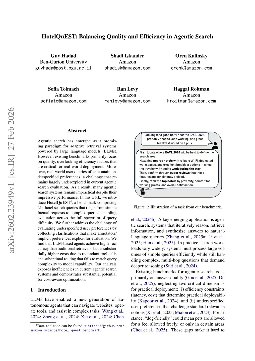 Agentic search has emerged as a promising paradigm for adaptive retrieval systems powered by large language models (LLMs). However, existing benchmarks primarily focus on quality, overlooking efficiency factors that are critical for real-world deployment. Moreover, real-world user queries often contain underspecified preferences, a challenge that remains largely underexplored in current agentic search evaluation. As a result, many agentic search systems remain impractical despite their impressive performance. In this work, we introduce HotelQuEST, a benchmark comprising 214 hotel search queries that range from simple factual requests to complex queries, enabling evaluation across the full spectrum of query difficulty. We further address the challenge of evaluating underspecified user preferences by collecting clarifications that make annotators' implicit preferences explicit for evaluation. We find that LLM-based agents achieve higher accuracy than traditional retrievers, but at substantially higher costs due to redundant tool calls and suboptimal routing that fails to match query complexity to model capability. Our analysis exposes inefficiencies in current agentic search systems and demonstrates substantial potential for cost-aware optimization.