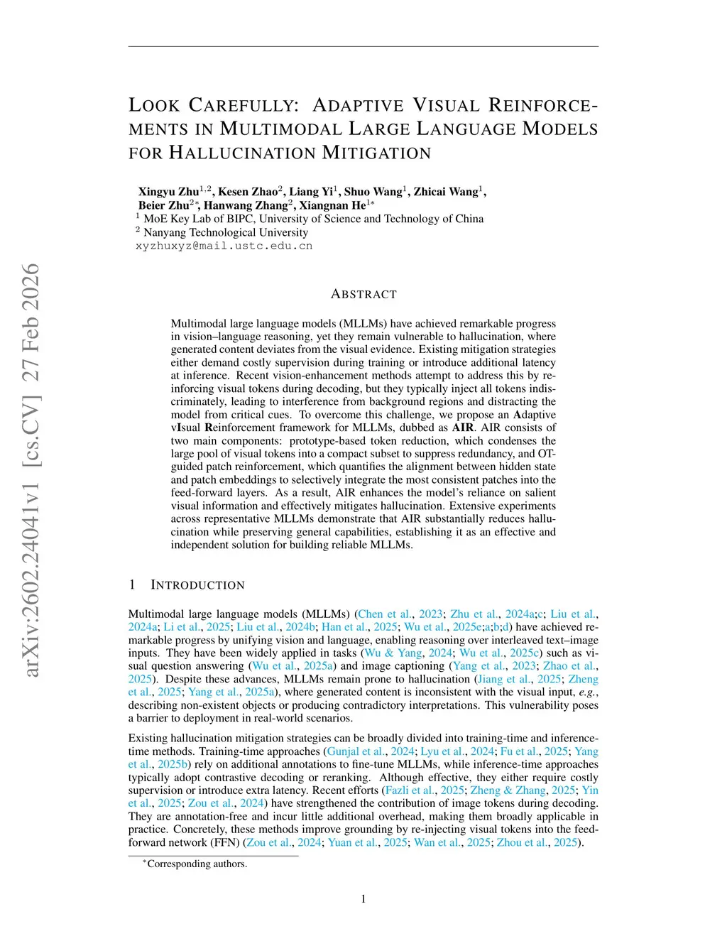 Multimodal large language models (MLLMs) have achieved remarkable progress in vision-language reasoning, yet they remain vulnerable to hallucination, where generated content deviates from visual evidence. Existing mitigation strategies either require costly supervision during training or introduce additional latency at inference time. Recent vision enhancement methods attempt to address this issue by reinforcing visual tokens during decoding, but they typically inject all tokens indiscriminately, which causes interference from background regions and distracts the model from critical cues. To overcome this challenge, we propose Adaptive Visual Reinforcement (AIR), a training-free framework for MLLMs. AIR consists of two components. Prototype-based token reduction condenses the large pool of visual tokens into a compact subset to suppress redundancy. OT-guided patch reinforcement quantifies the alignment between hidden states and patch embeddings to selectively integrate the most consistent patches into feed-forward layers. As a result, AIR enhances the model's reliance on salient visual information and effectively mitigates hallucination. Extensive experiments across representative MLLMs demonstrate that AIR substantially reduces hallucination while preserving general capabilities, establishing it as an effective solution for building reliable MLLMs.