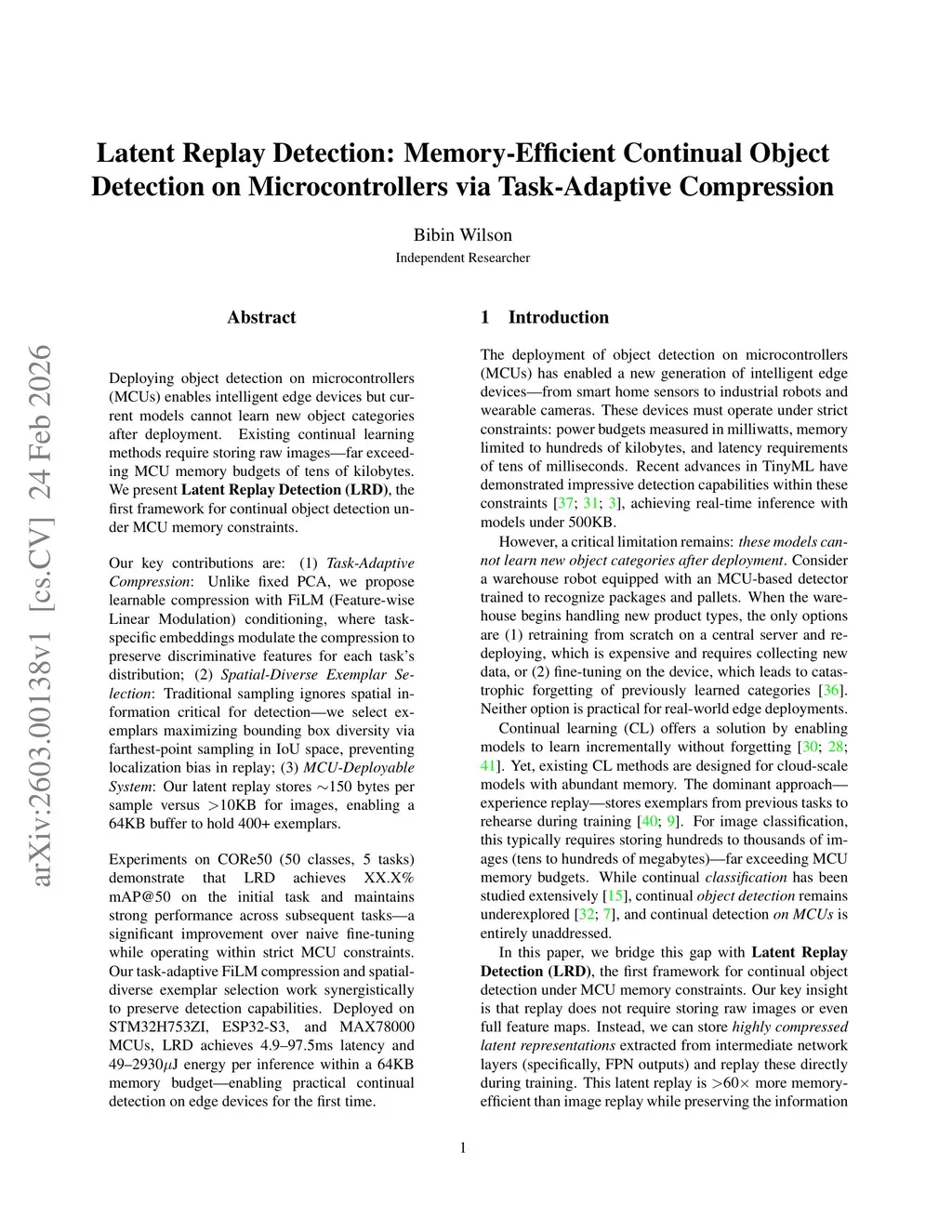Deploying object detection on microcontrollers (MCUs) enables intelligent edge devices but current models cannot learn new object categories after deployment. Existing continual learning methods require storing raw images far exceeding MCU memory budgets of tens of kilobytes. We present Latent Replay Detection (LRD), the first framework for continual object detection under MCU memory constraints. Our key contributions are: 1. Task-Adaptive Compression: Unlike fixed PCA, we propose learnable compression with FiLM (Feature-wise Linear Modulation) conditioning, where task specific embeddings modulate the compression to preserve discriminative features for each task's distribution; 2. Spatial-Diverse Exemplar Selection: Traditional sampling ignores spatial information critical for detection - we select exemplars maximizing bounding box diversity via farthest-point sampling in IoU space, preventing localization bias in replay; 3. MCU-Deployable System: Our latent replay stores 150 bytes per sample versus >10KB for images, enabling a 64KB buffer to hold 400+ exemplars. Experiments on CORe50 (50 classes, 5 tasks) demonstrate that LRD achieves mAP@50 on the initial task and maintains strong performance across subsequent tasks - a significant improvement over naive fine-tuning while operating within strict MCU constraints. Our task-adaptive FiLM compression and spatial diverse exemplar selection work synergistically to preserve detection capabilities. Deployed on STM32H753ZI, ESP32-S3, and MAX78000 MCUs, LRD achieves 4.9-97.5ms latency per inference within a 64KB memory budget-enabling practical continual detection on edge devices for the first time.
