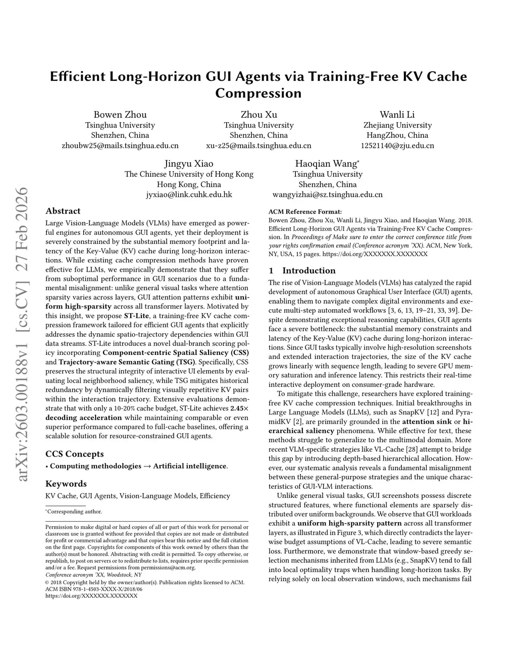 Large Vision-Language Models (VLMs) have emerged as powerful engines for autonomous GUI agents, yet their deployment is severely constrained by the substantial memory footprint and latency of the Key-Value (KV) cache during long-horizon interactions. While existing cache compression methods have proven effective for LLMs, we empirically demonstrate that they suffer from suboptimal performance in GUI scenarios due to a fundamental misalignment: unlike general visual tasks where attention sparsity varies across layers, GUI attention patterns exhibit uniform high-sparsity across all transformer layers. Motivated by this insight, we propose ST-Lite, a training-free KV cache compression framework tailored for efficient GUI agents that explicitly addresses the dynamic spatio-trajectory dependencies within GUI data streams. ST-Lite introduces a novel dual-branch scoring policy incorporating Component-centric Spatial Saliency (CSS) and Trajectory-aware Semantic Gating (TSG). Specifically, CSS preserves the structural integrity of interactive UI elements by evaluating local neighborhood saliency, while TSG mitigates historical redundancy by dynamically filtering visually repetitive KV pairs within the interaction trajectory. Extensive evaluations demonstrate that with only a 10-20% cache budget, ST-Lite achieves a 2.45x decoding acceleration while maintaining comparable or even superior performance compared to full-cache baselines, offering a scalable solution for resource-constrained GUI agents.