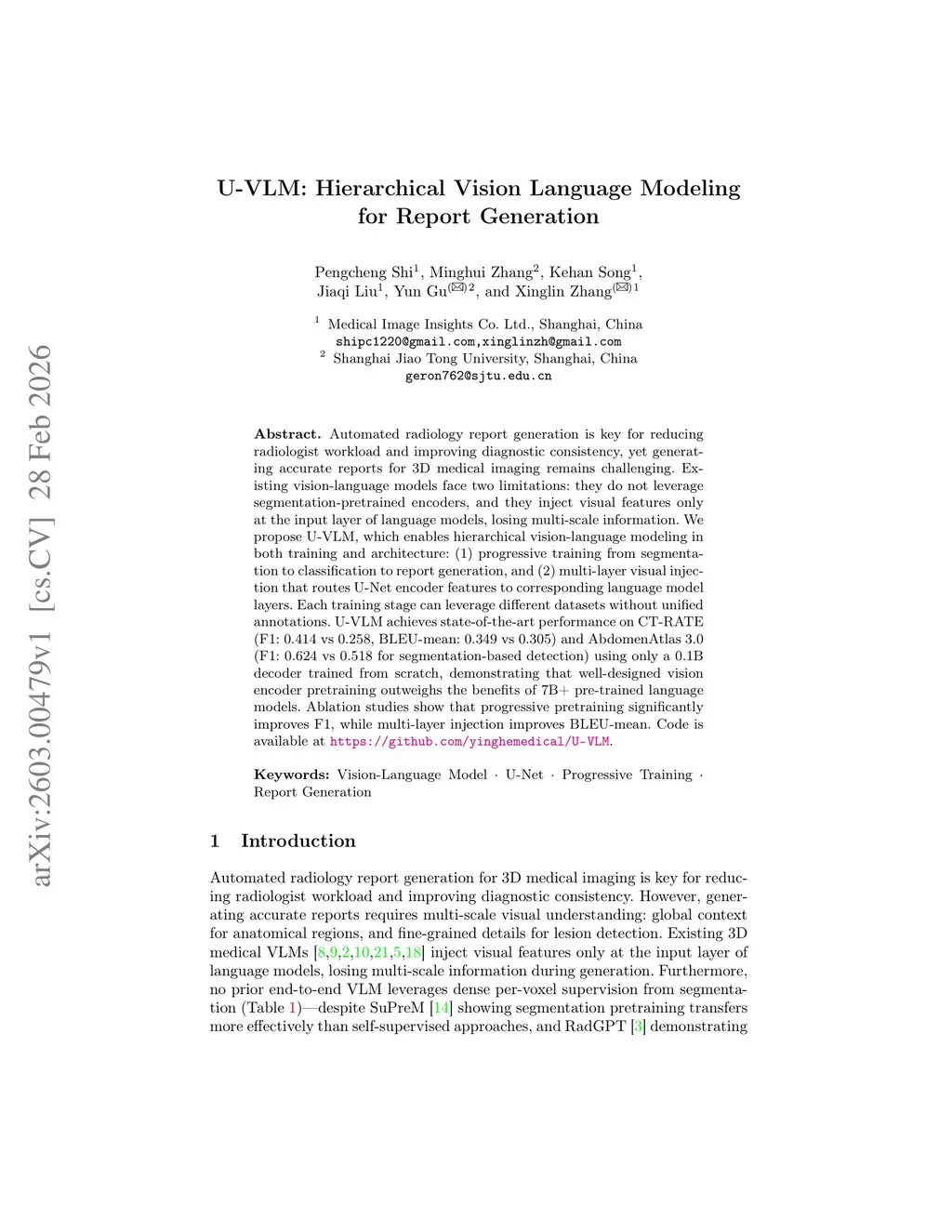 Automated radiology report generation is key for reducing radiologist workload and improving diagnostic consistency, yet generating accurate reports for 3D medical imaging remains challenging. Existing vision-language models face two limitations: they do not leverage segmentation-pretrained encoders, and they inject visual features only at the input layer of language models, losing multi-scale information. We propose U-VLM, which enables hierarchical vision-language modeling in both training and architecture: (1) progressive training from segmentation to classification to report generation, and (2) multi-layer visual injection that routes U-Net encoder features to corresponding language model layers. Each training stage can leverage different datasets without unified annotations. U-VLM achieves state-of-the-art performance on CT-RATE (F1: 0.414 vs 0.258, BLEU-mean: 0.349 vs 0.305) and AbdomenAtlas 3.0 (F1: 0.624 vs 0.518 for segmentation-based detection) using only a 0.1B decoder trained from scratch, demonstrating that well-designed vision encoder pretraining outweighs the benefits of 7B+ pre-trained language models. Ablation studies show that progressive pretraining significantly improves F1, while multi-layer injection improves BLEU-mean. Code is available atthis https URL.